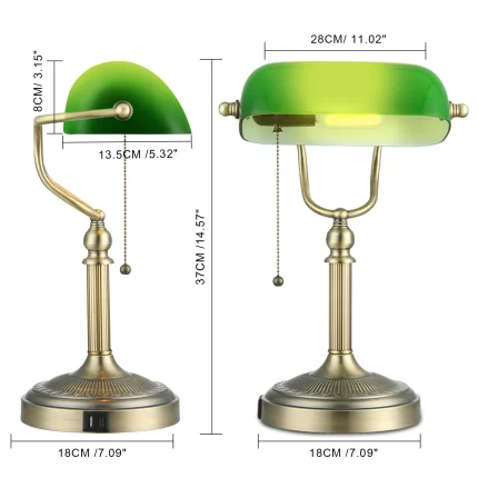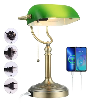Sleek Illumination Modern Green Glass Bankers Desk Lamp with Pull Chain Switch and USB Fast Charging Port