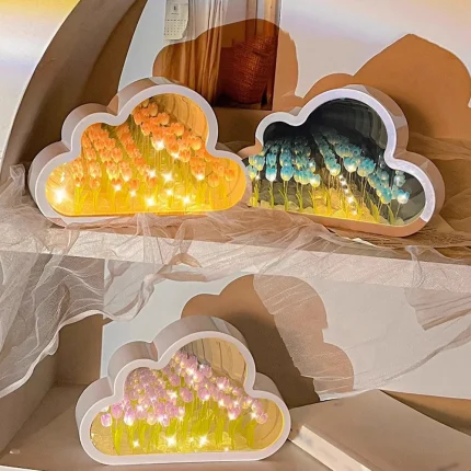 Cloud Mirror Tulip Lamp LED Night Light Bedroom Ornaments Creative Photo Frame Mirror Table Lamps Bedside DIY Valentines Gifts