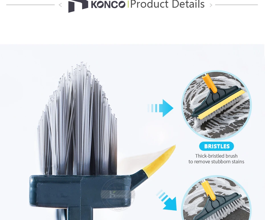 1.Floor Scrub Brush 2 in 1 Scrape&brush Push Broom Effective, Easy & Save Effort Brush + scraper 2 in 1 design floor scrub brush with stiff bristle + rubber squeegee; Strong cleaning ability; Brush + scrape steps to easily remove the stain, stubborn grime, dirty water, and dust; Improve effectiveness when you doing housework.