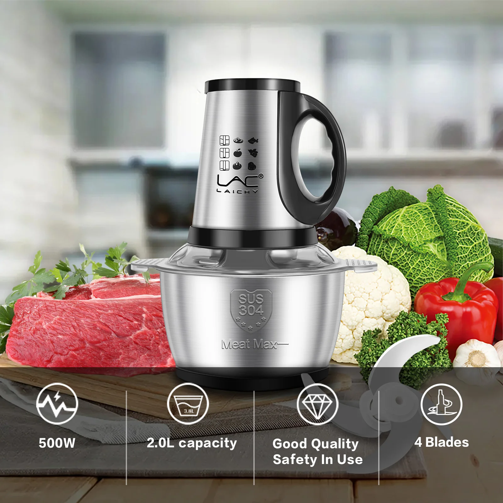 2L Stainless Steel Meat Grinder with Detachable Blade