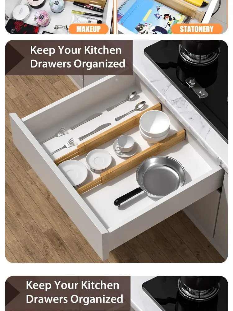 1. Kitchen drawer dividers are perfectly designed to fit into every drawer, these drawer dividers expand from 17.5″ to 22″ and are 2.8″ high. They can be placed vertically or horizontally, and even stacked in the drawer.
