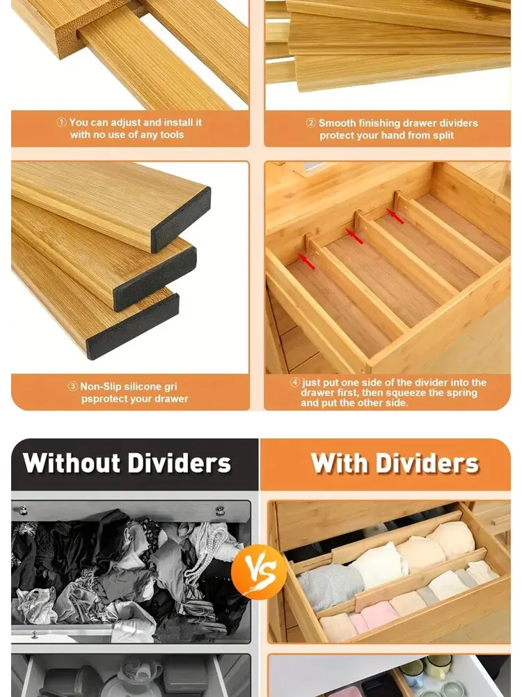 2. Each drawer divider has a built in spring to keep them in place and easy adjustment to meet your changing needs. Great sock drawer organizer or dresser drawer dividers.