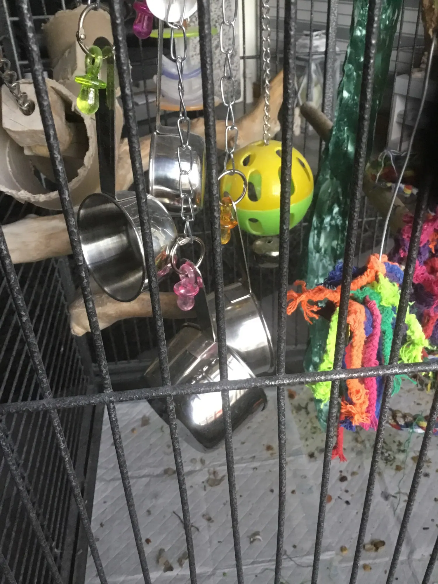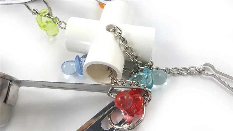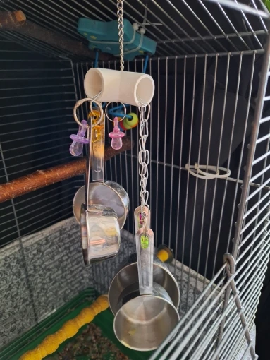 2. There are 4 stainless steel cups and colored acrylic pacifiers, and the sound is loud and pleasing, and the parrot particularly likes.