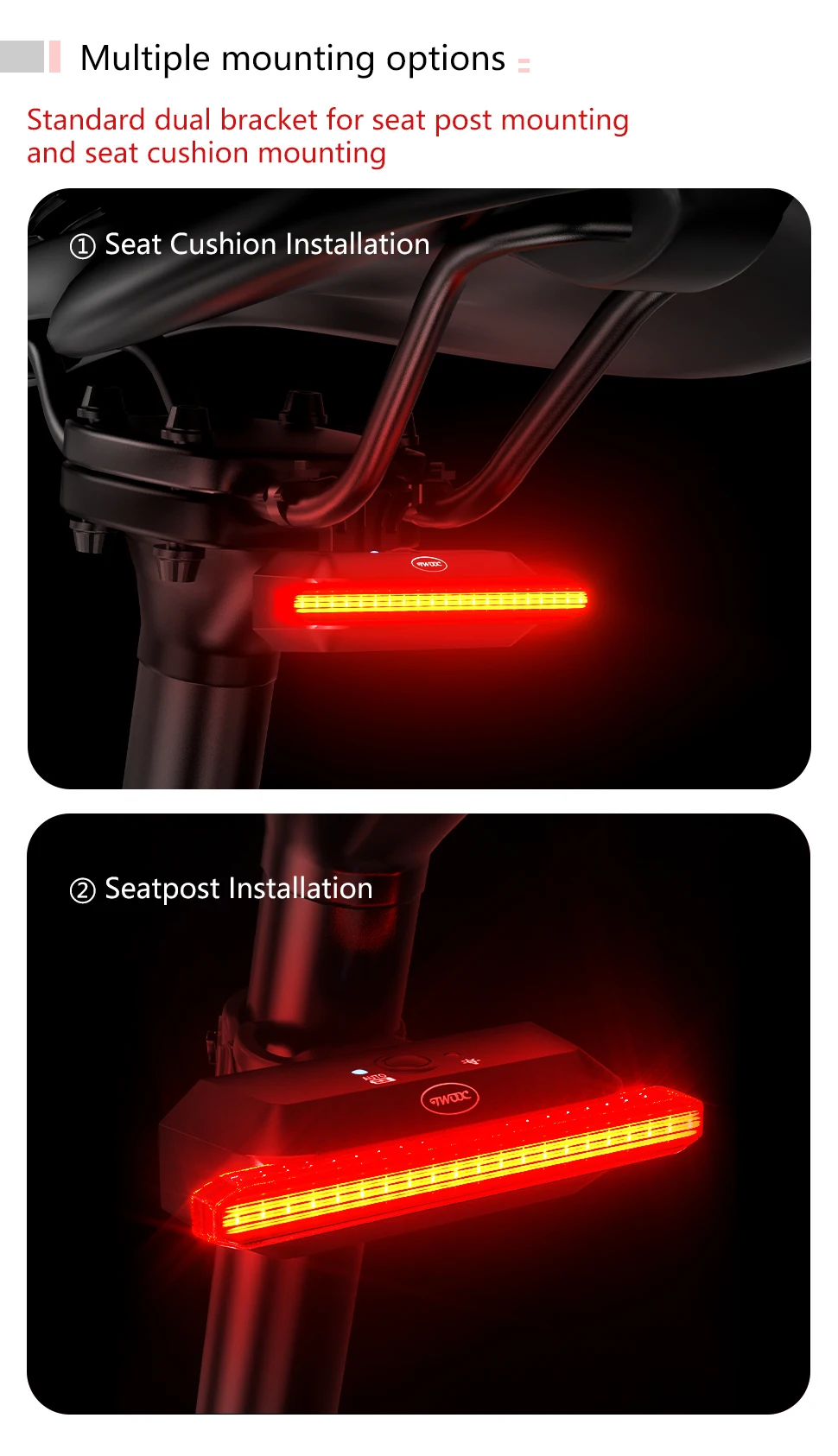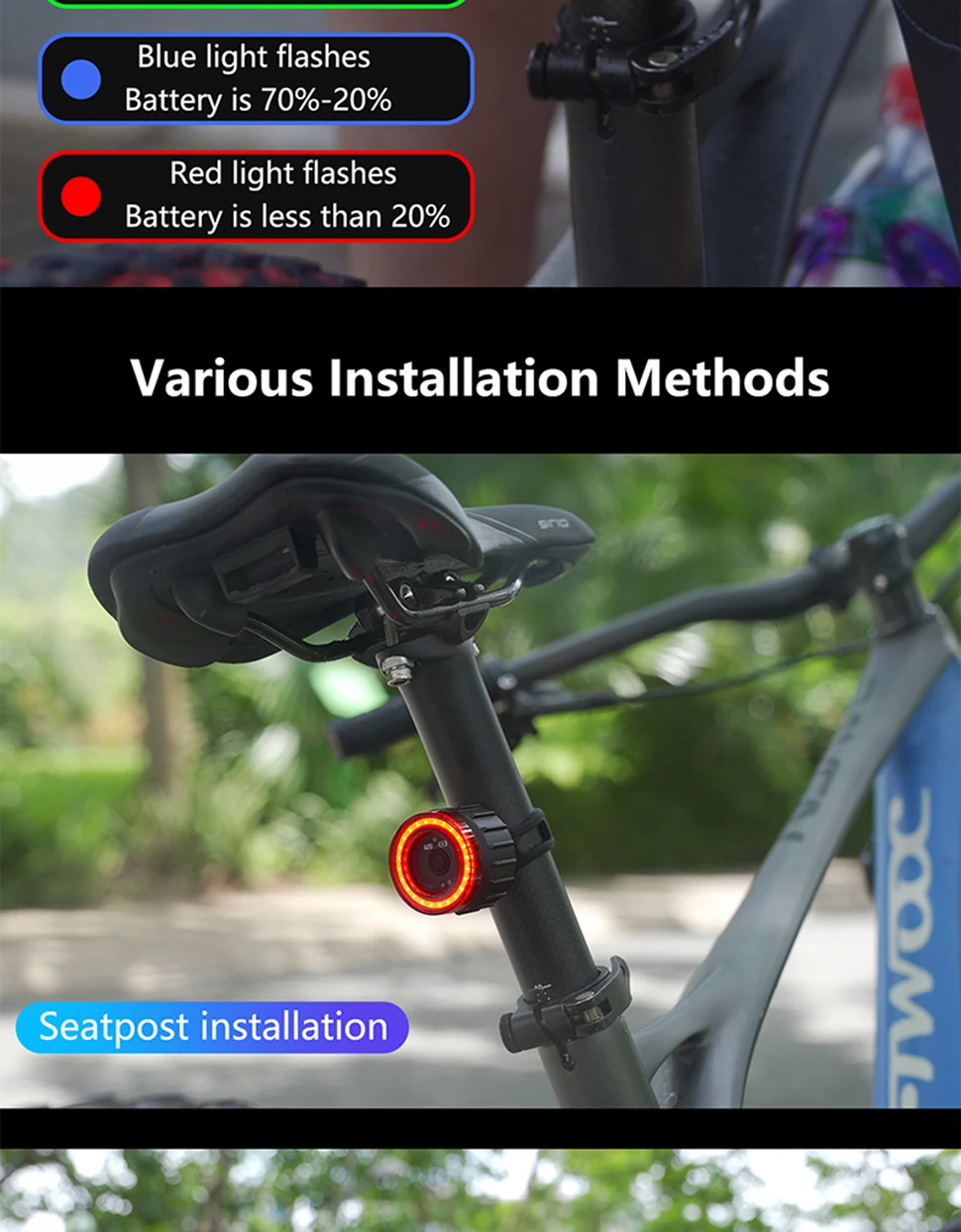 【Easy to install】 You can mount it under the saddle with a metal mounting bracket, or to the seat post with an adjustable silicone strap.