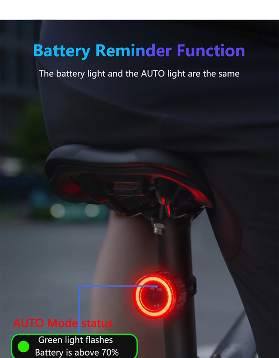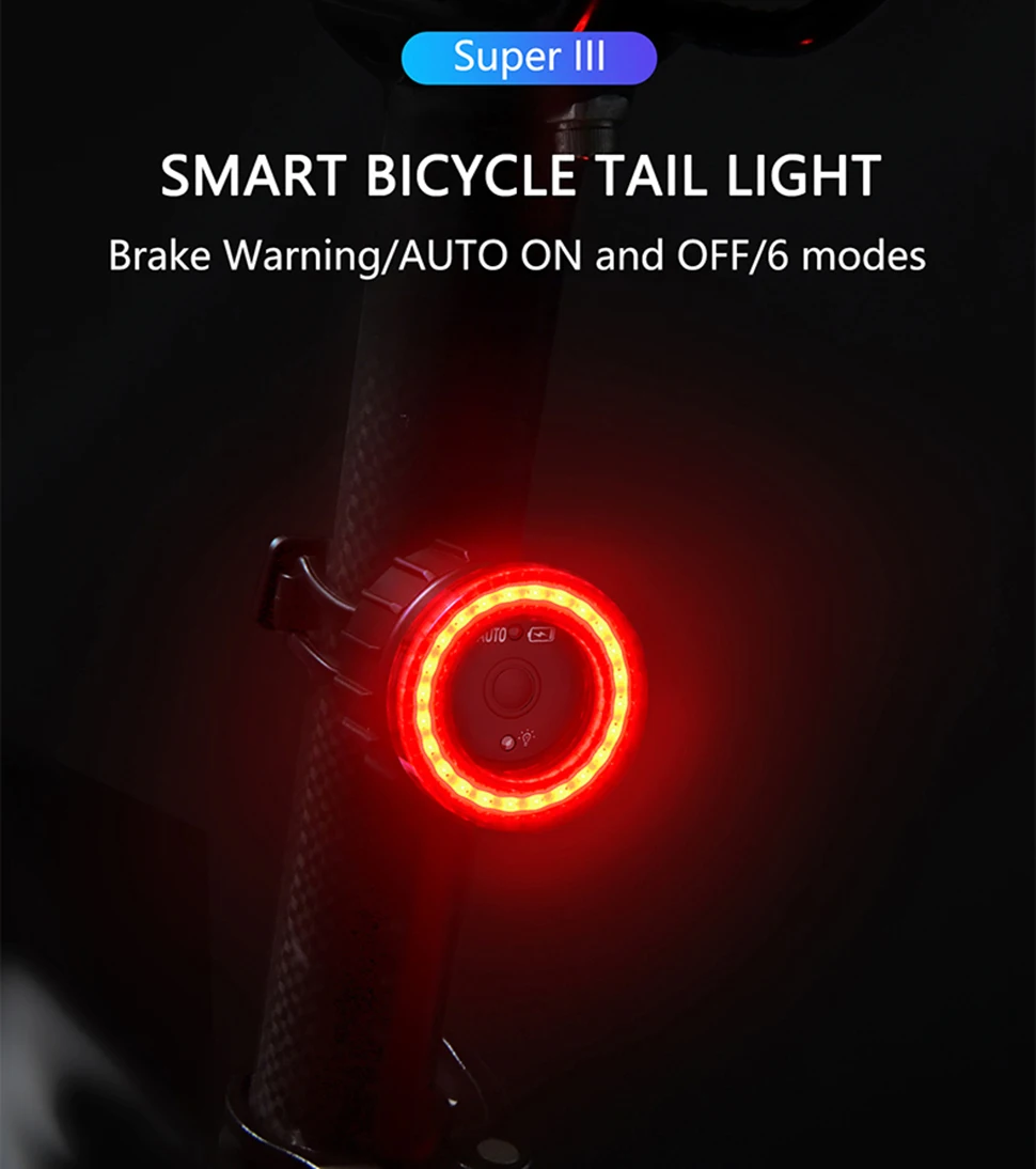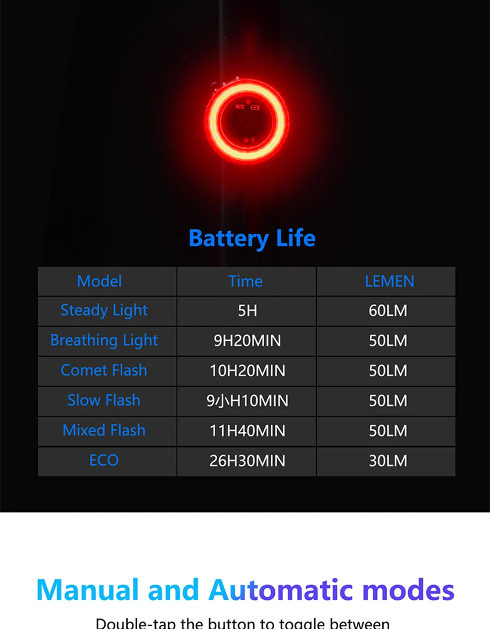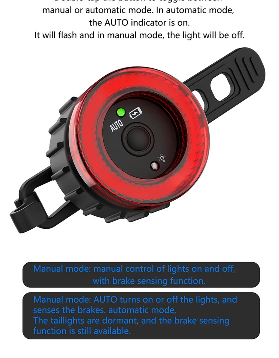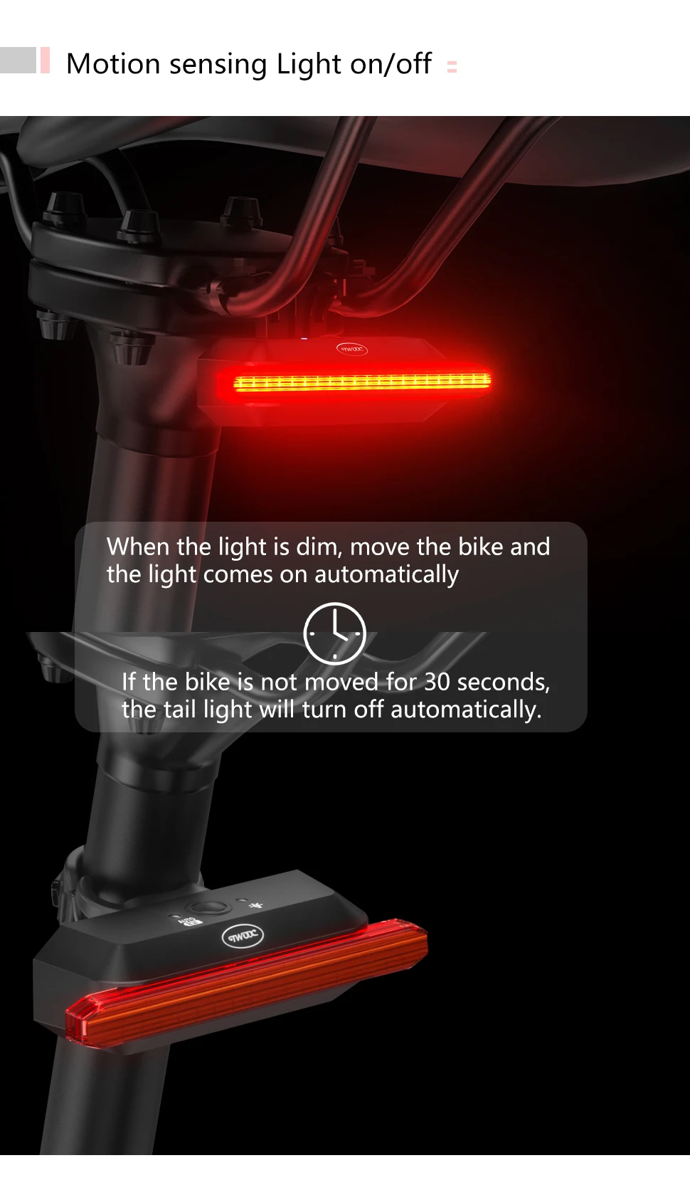 【Double click manual / automatic switching】 Double click the button to switch the racing bike tail light to manual or automatic mode. This bicycle lights includes motion sensor and light sensor. When moving the bicycle, the light is dim – the rear light turns on automatically; if the bicycle is not moved within 30 seconds, the rear light will automatically turn off. Long press to turn on and off during manual mode. The light will be auto on/off during auto mode, but it can’t turn off.