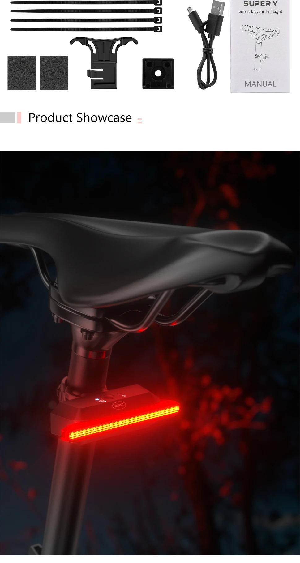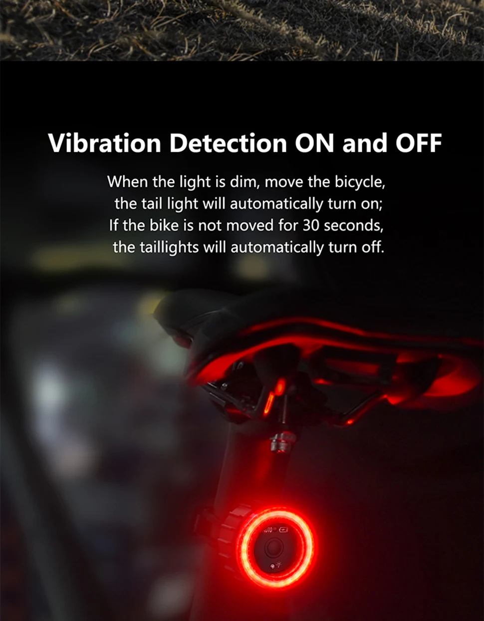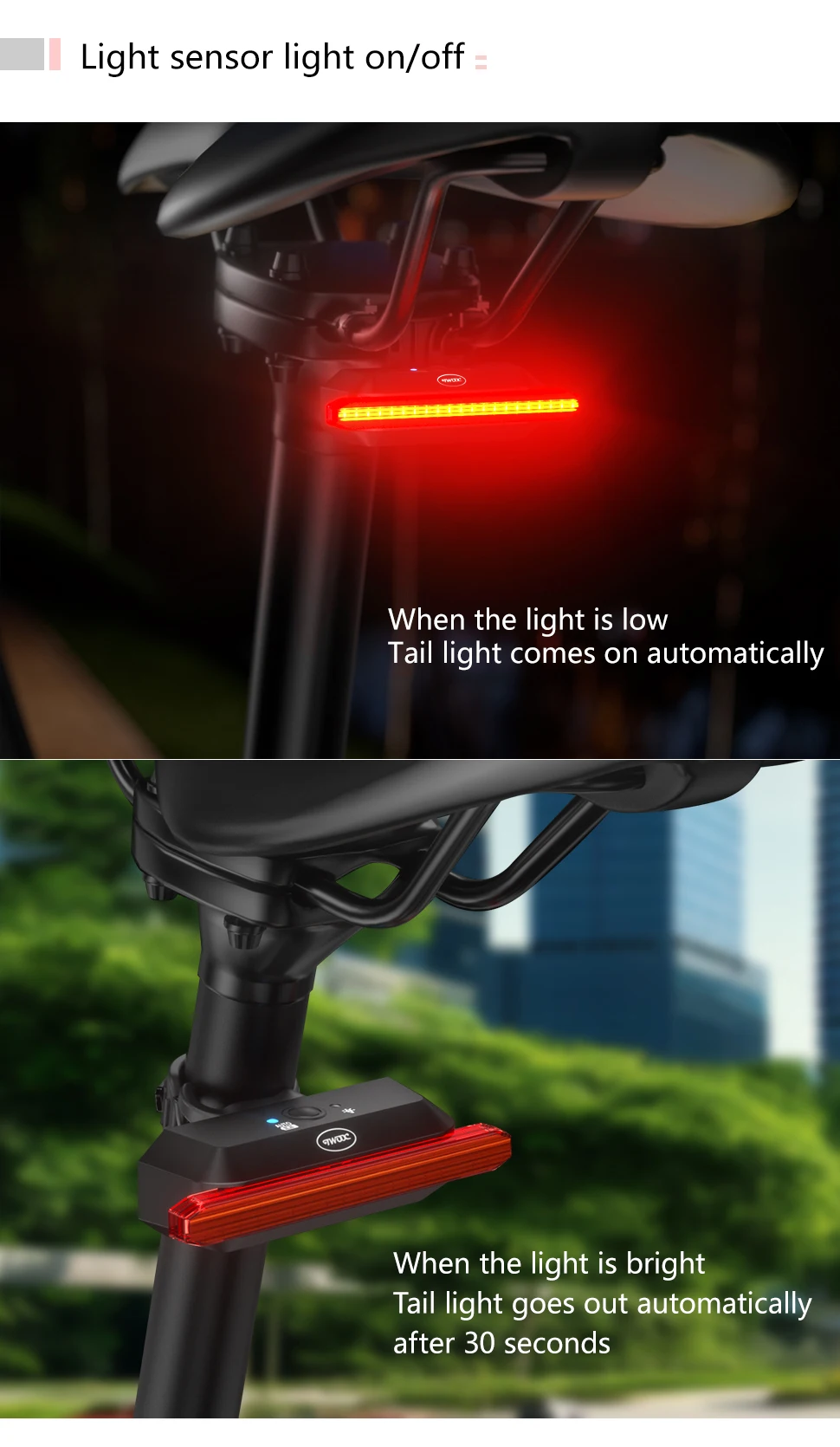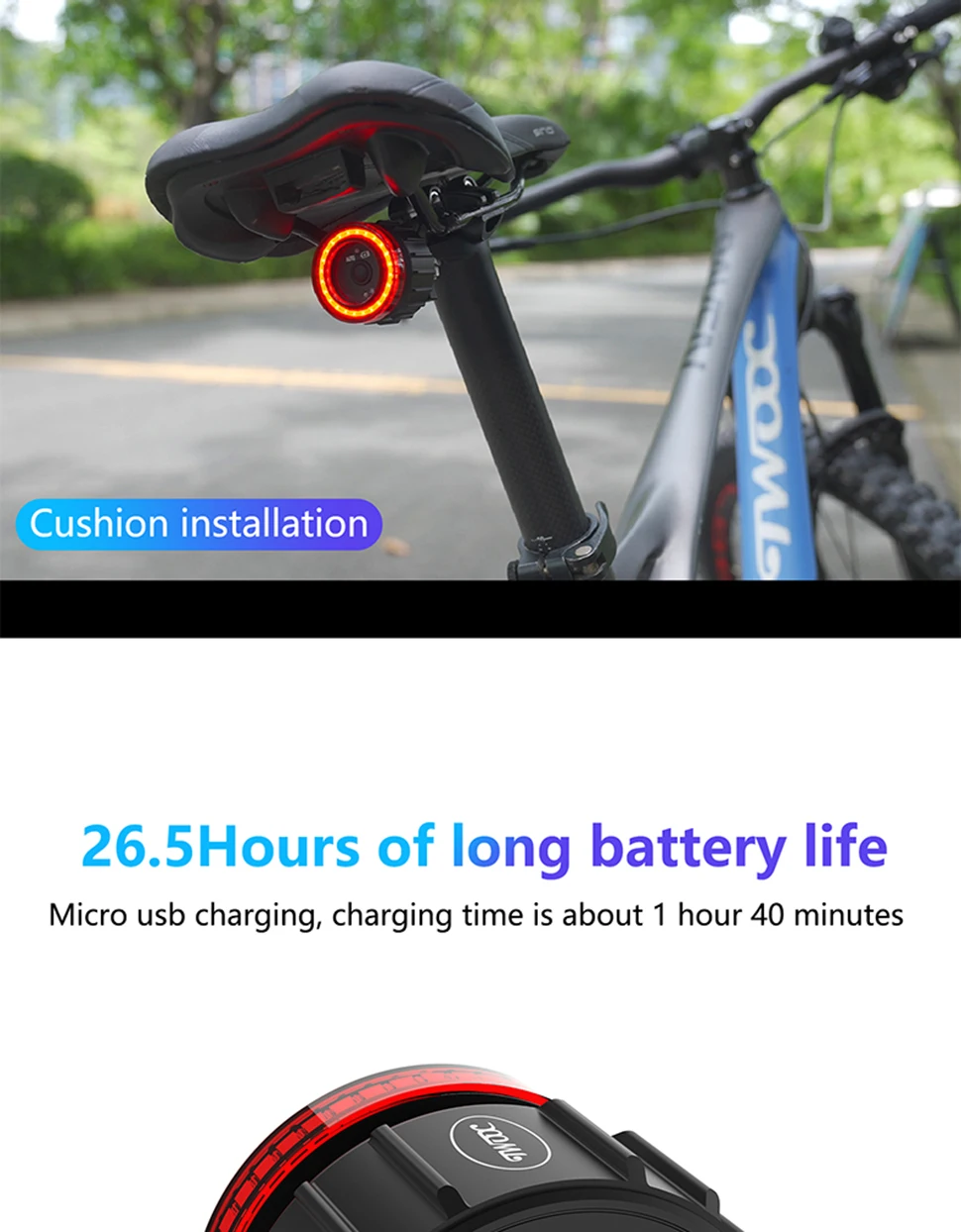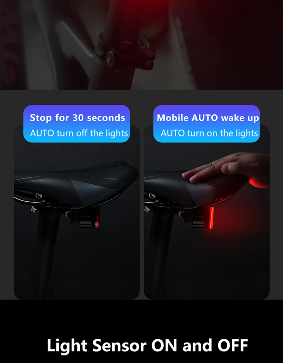 【Double click manual / automatic switching】 Double click the button to switch the racing bike tail light to manual or automatic mode. This bicycle lights includes motion sensor and light sensor. When moving the bicycle, the light is dim – the rear light turns on automatically; if the bicycle is not moved within 30 seconds, the rear light will automatically turn off. Long press to turn on and off during manual mode. The light will be auto on/off during auto mode, but it can’t turn off.