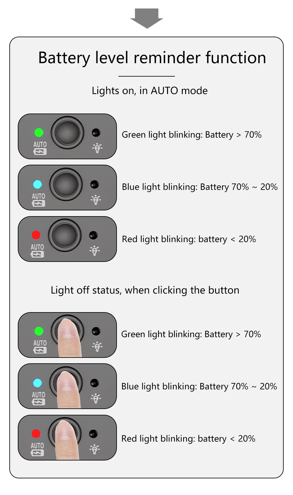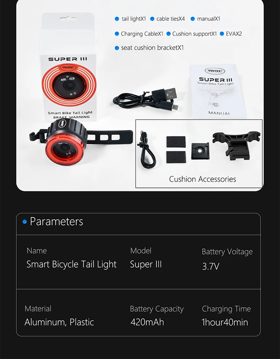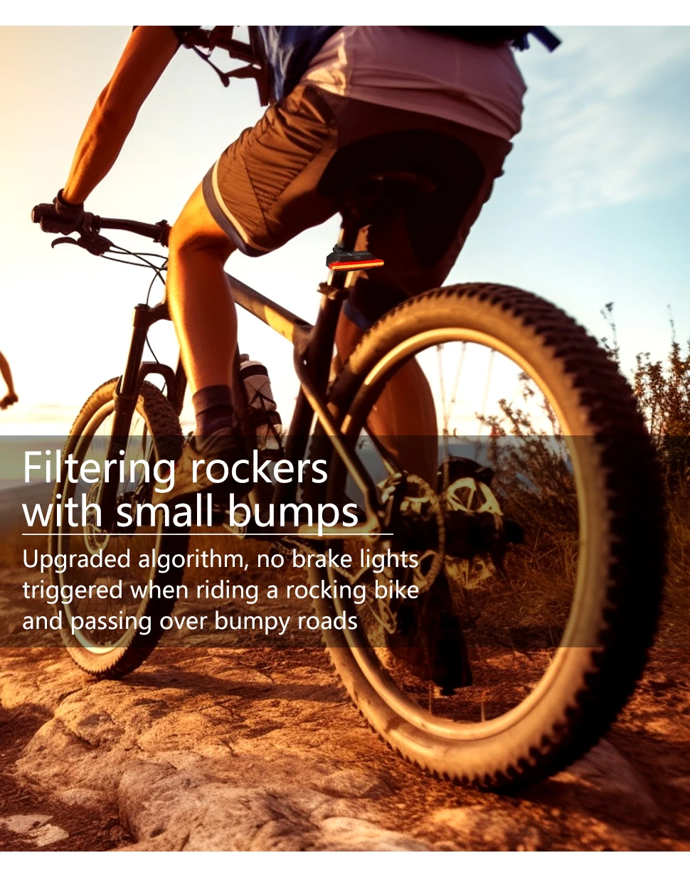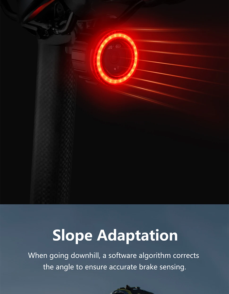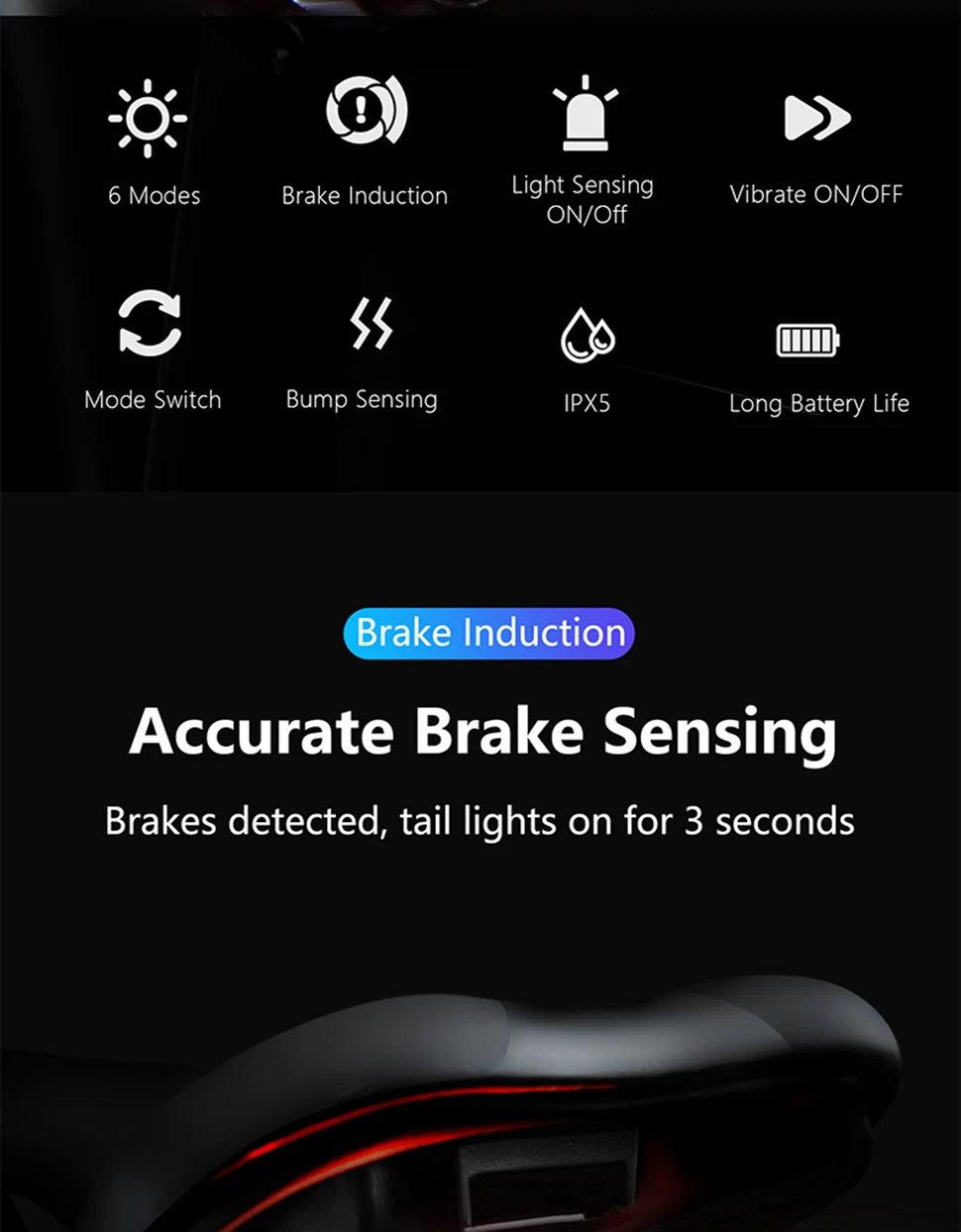 【Double click manual / automatic switching】 Double click the button to switch the racing bike tail light to manual or automatic mode. This bicycle lights includes motion sensor and light sensor. When moving the bicycle, the light is dim – the rear light turns on automatically; if the bicycle is not moved within 30 seconds, the rear light will automatically turn off. Long press to turn on and off during manual mode. The light will be auto on/off during auto mode, but it can’t turn off.