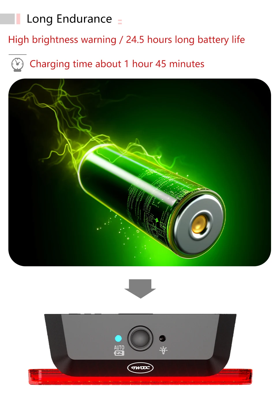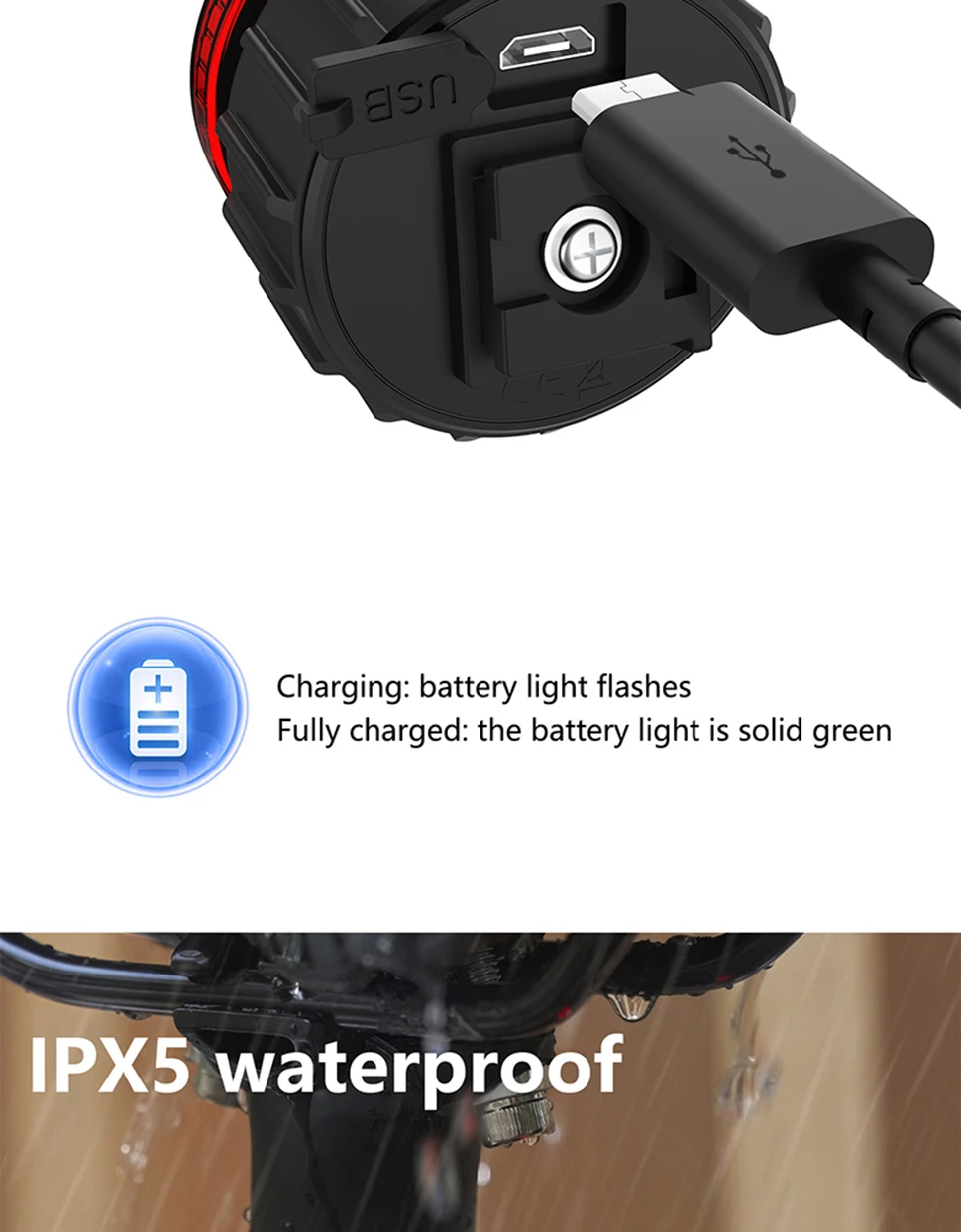 【IPX5 Waterproof and USB Rechargeable】 The bike taillight adopts a sealed case, which is waterproof and your reliable companion in bad weather. Charging 1 hour and 40 minutes = battery life of 26.5 hours of work. Charging method: power bank, USB charger or computer (fully charge before first use).
