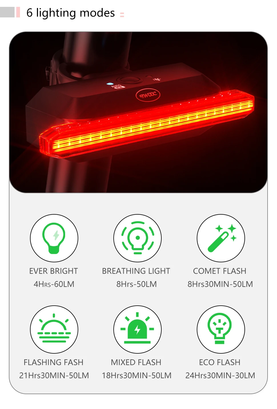【6 lighting modes】 ① Continuous light-60LM / 5H② Respiratory flash-50LM / 9.3H③ Comet flash-50LM / 10.3H④ Slow flash-50LM / 9.1H⑤ Mixed flash-50LM / 11.6H⑥ ECO flash-30LM-26.5 (if you want for a mtb lights to longer lasting light, select the sixth light mode – ECO flashing mode)