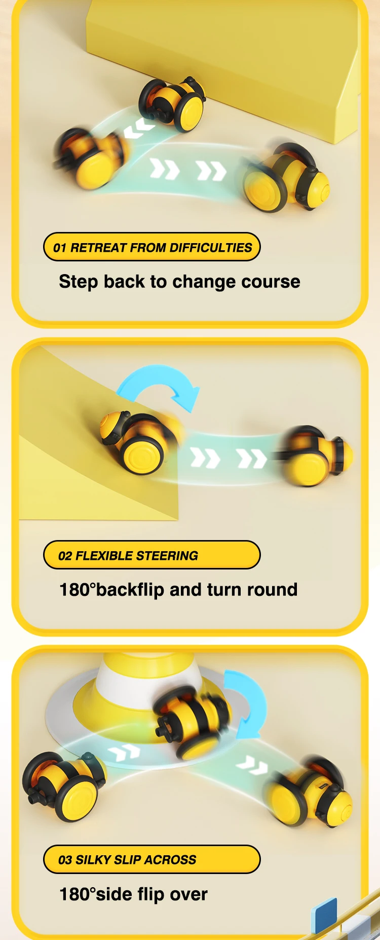 2. Obstacle recognition: When encountering obstacles, the toy car can flexibly change its trajectory without being trapped or stuck.