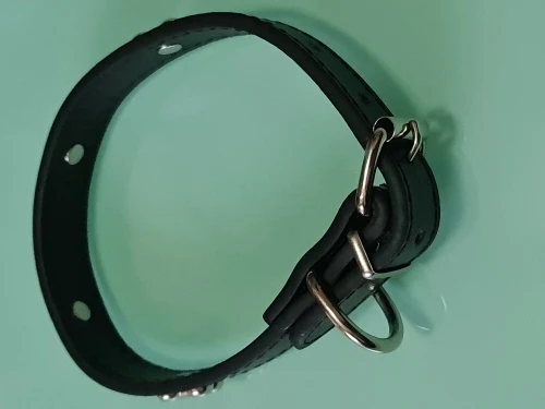 For the price it has, it serves me. It is PU with bone-shaped studs. The length is the necessary for my 8kg dog.