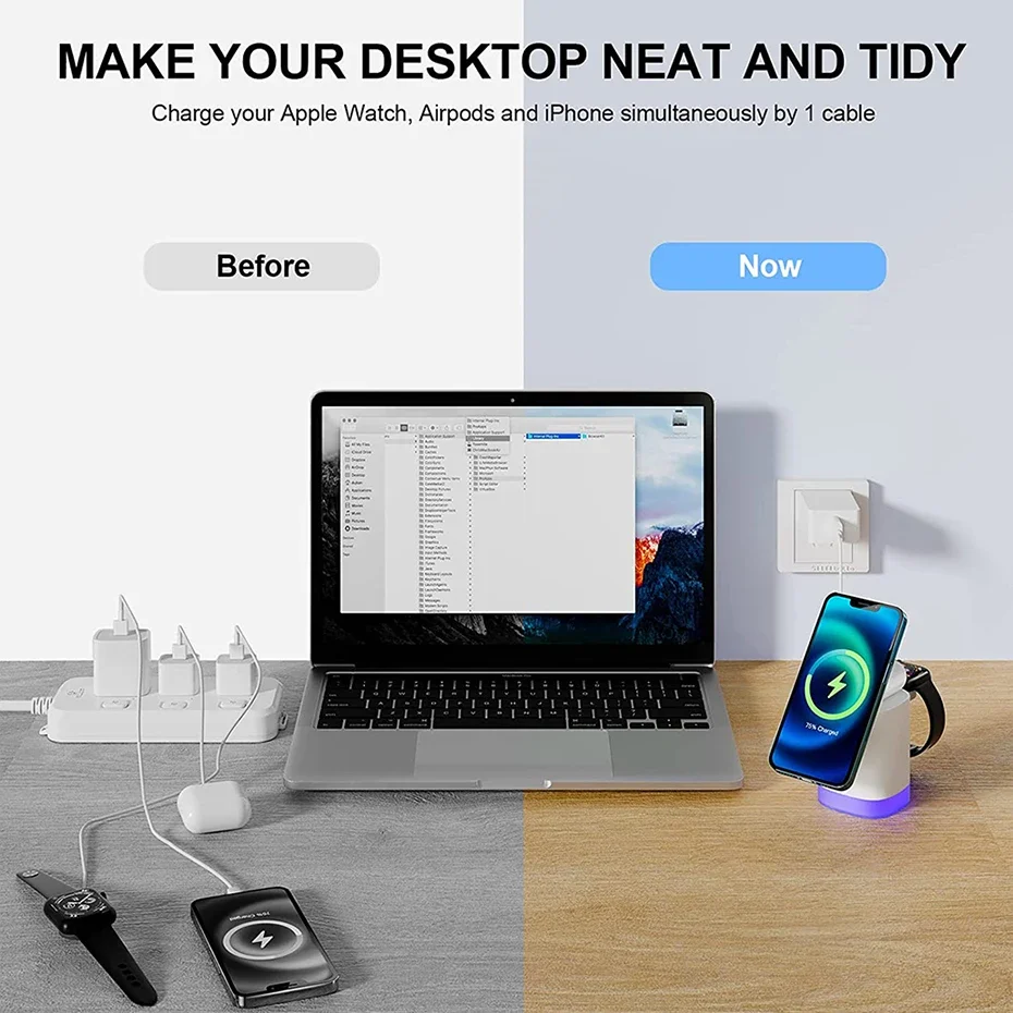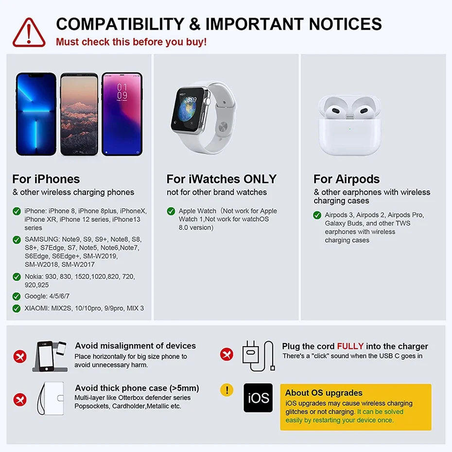 This charging station is suitable for various Apple devices (for iPhone 14/13/12 Series Macsafe /11/11 Pro/11 Pro Max/XS/ XR / XS MAX /X/8/8Plus (can wirelessly charge qi mobile phones, watch models only support Apple Watch Ulltra/SE/8/7/6/5/4/3)