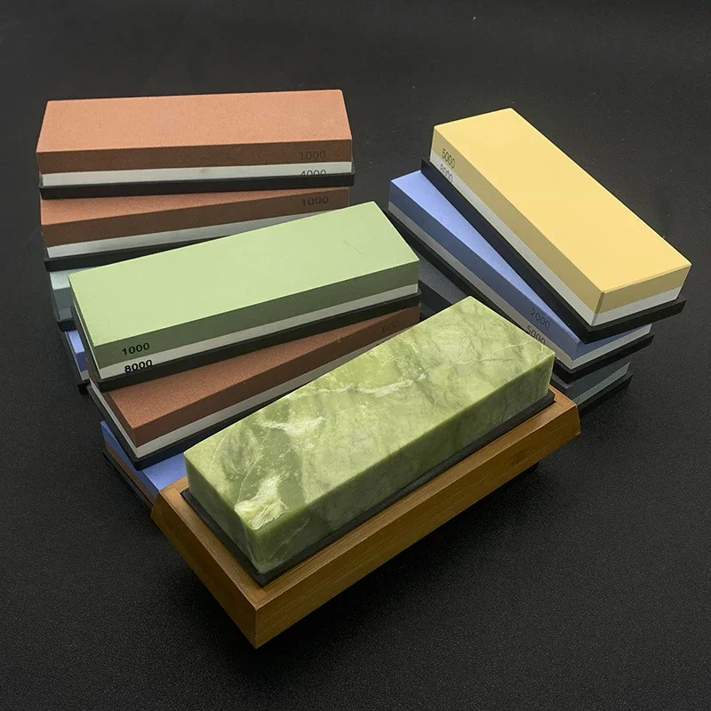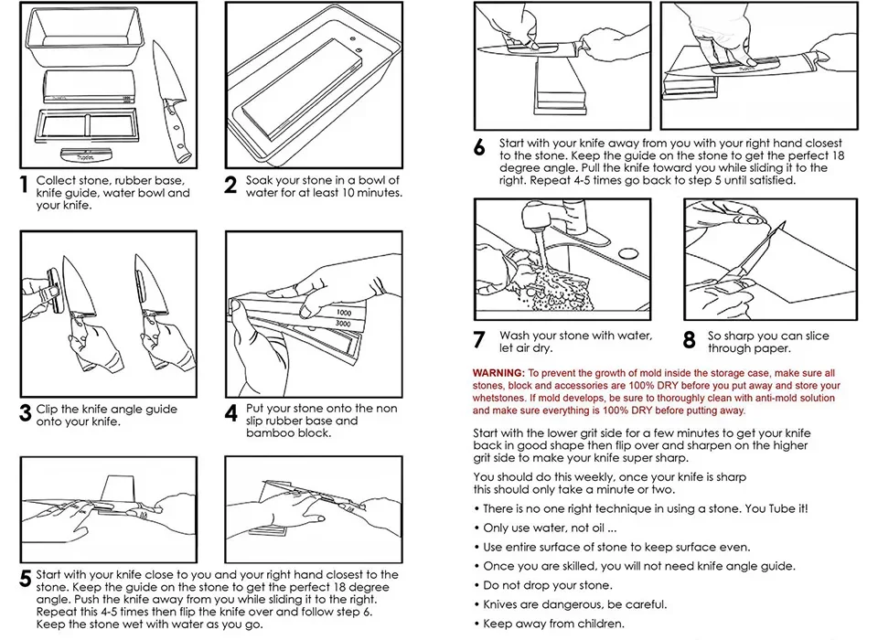 1.Soak the stone in the water for 5-15 minutes, and then put it on a steady platform. Sharpening the kniveswith one or two steps is decided by the degree of blunt tool.