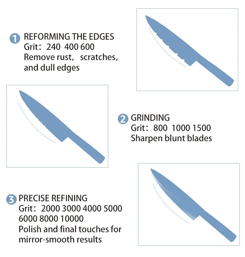 Step 1: Coarse grinding, used to repair the seriously dam aged edge,suitable for blunt knives.Hold the knifeat an angle of 10 – 30 deg, grind the edge on the surface of stone back and forth with gentle pressure,and sharpen it until the edge sharp enough. After sharpening the tool, it needs to be honed with coarse grindingafter half a year. Also depends on the specific situation.