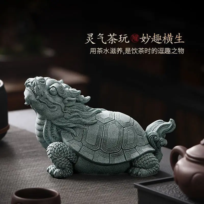 Auspicious Beast, Chinese-style Basalt Dragon Turtle Tea Pet Ornament