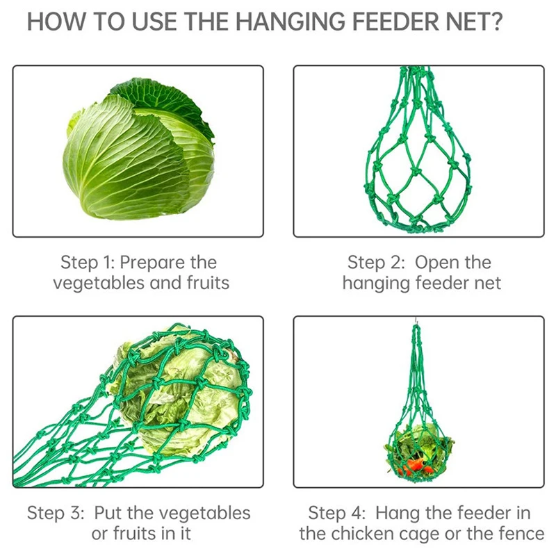 2. The hanging feeder net can easily put various vegetables and fruits into the pocket, and hang them in the fence or chicken coop to prevent the chicken from stepping on the food and waste food, allowing the chicken to eat fresh vegetables and fruits at all the time.