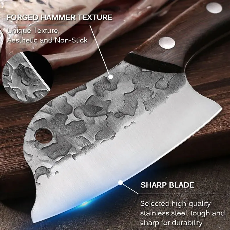 • Ultra-sharp blade :The Meat Cleaver Hand Forged Full Tang Kitchen Knife has an ultra-sharp blade that can easily cut through meat and bones.