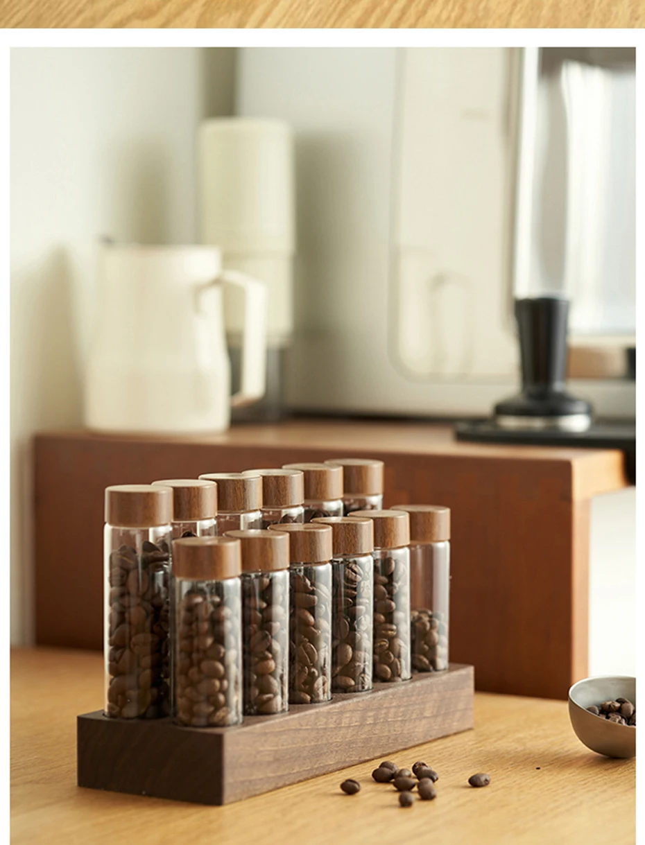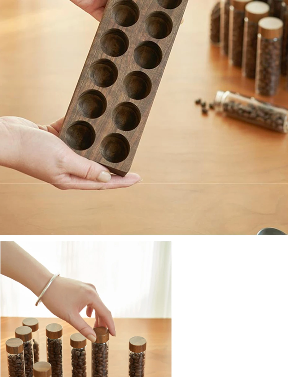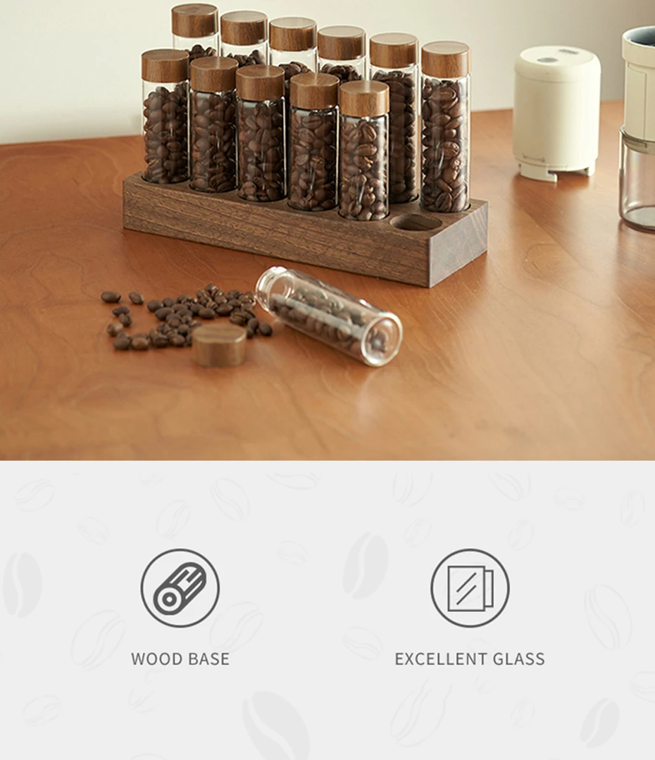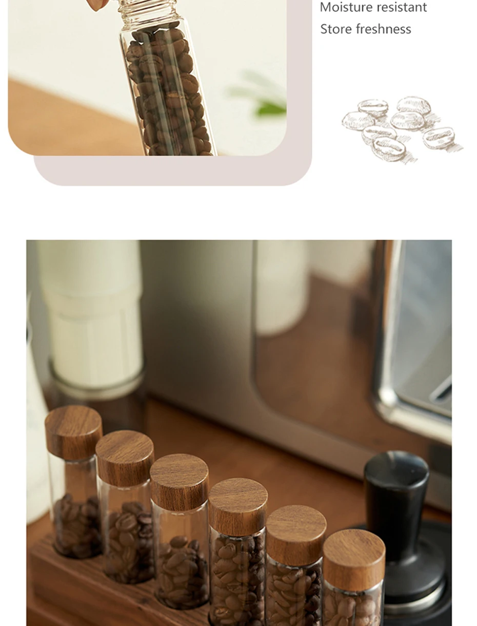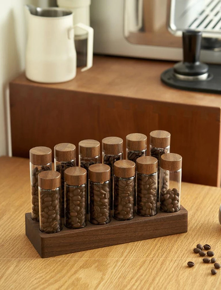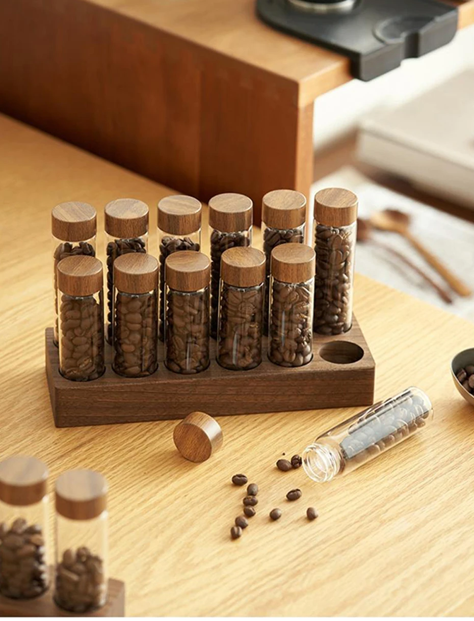 Glass Coffee Beans Storage Tubes with Walnut Rack