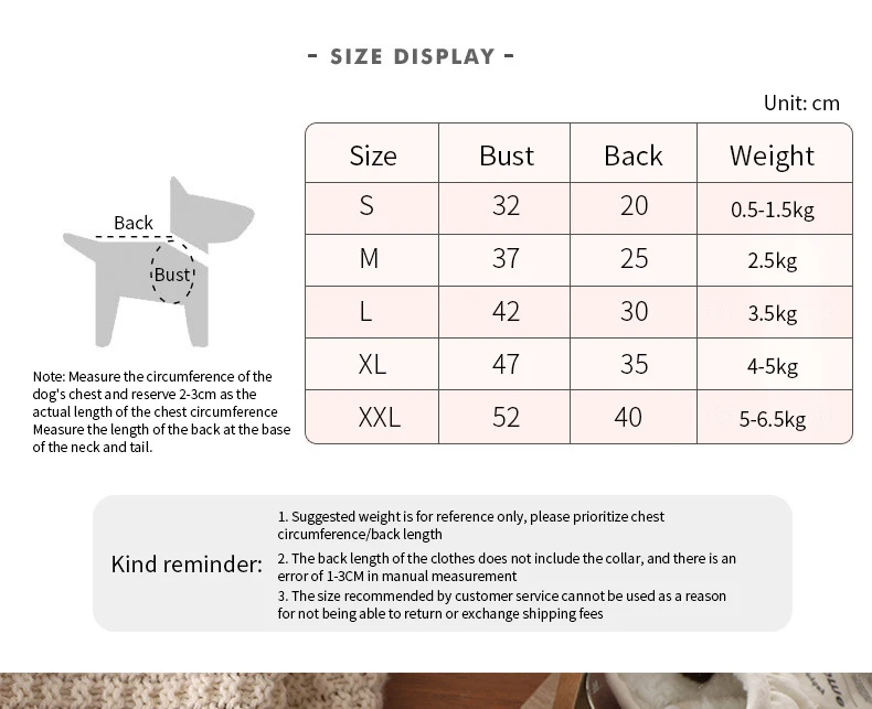 It is recommended to choose the size according to your pet’s chest circumference and back length data, choosing according to the weight may result in the size being too small, please reserve 2-3cm of space when choosing the size, in order to avoid resulting in the clothes being too small for your pet to be uncomfortable. Thank you for your understanding, please choose the correct size according to the size chart.