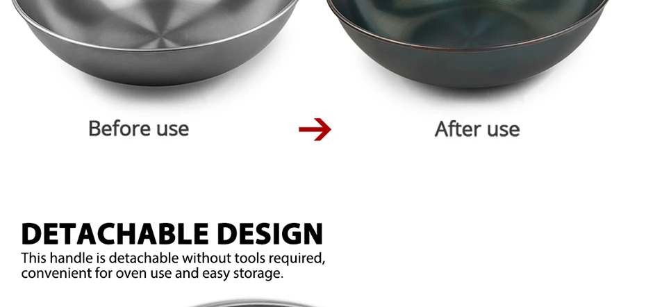 3.Detachable design for oven use and easy storage. The hanging ring for hanging storage, easy to dry. The wood ergonomic handle keeps cool when cooking at high temperature, which ensures a comfy and tight grip as well.