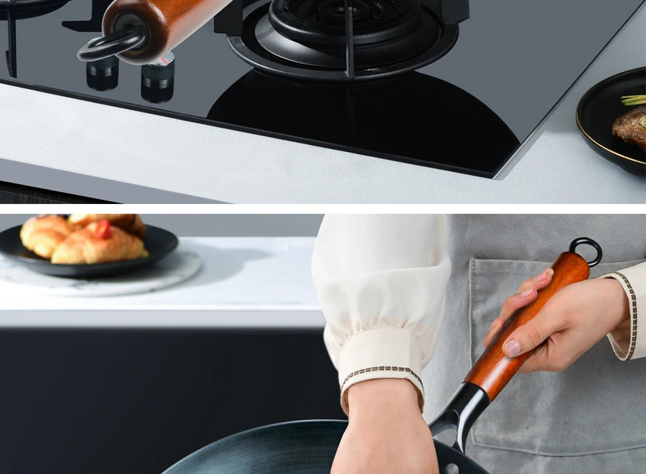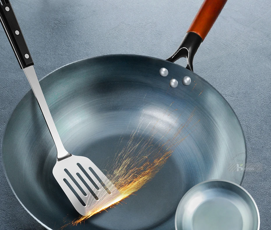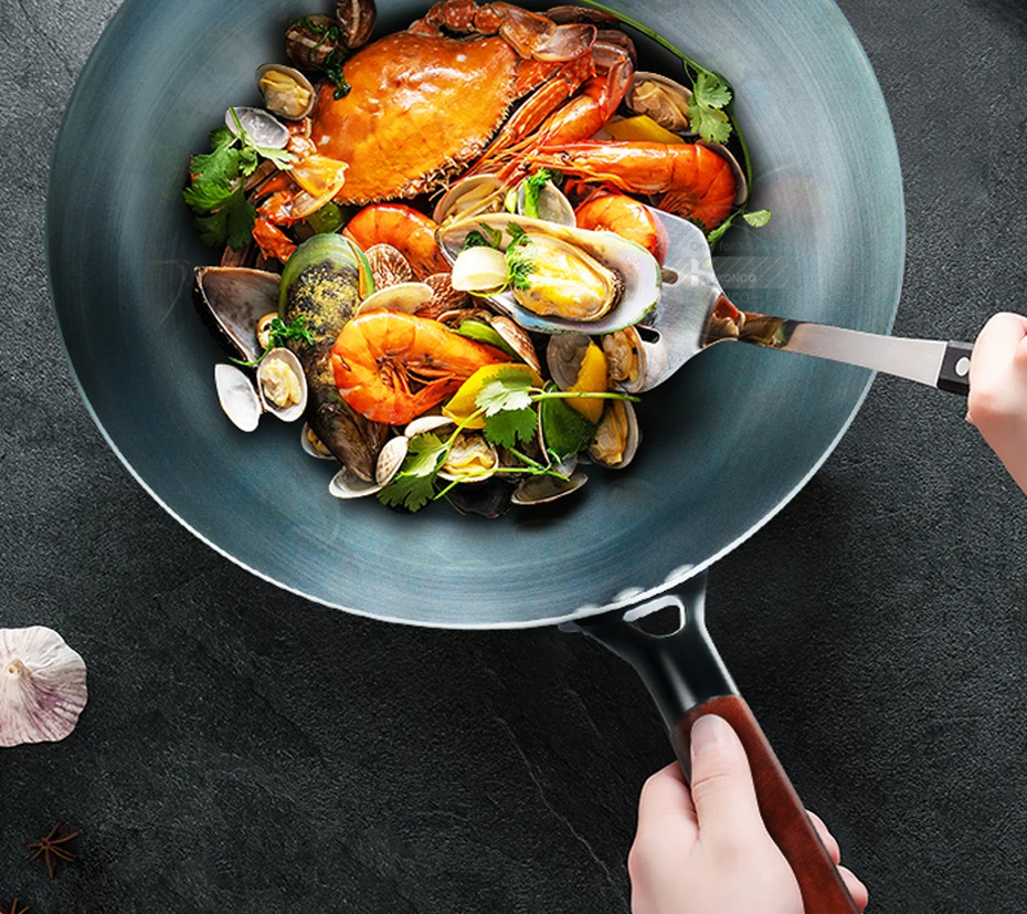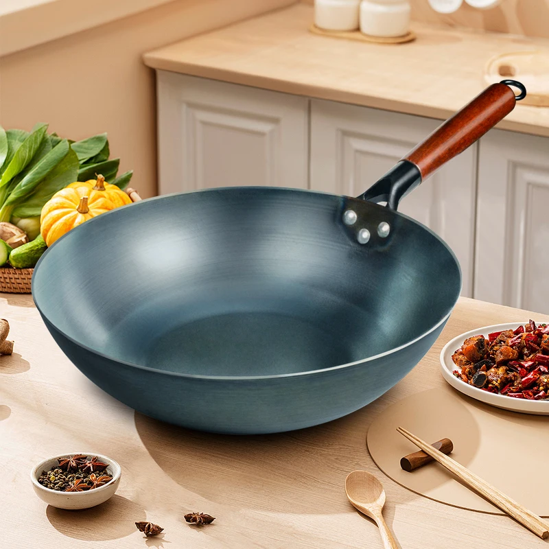 Handmade Iron Wok with Wooden Handle for Cooking