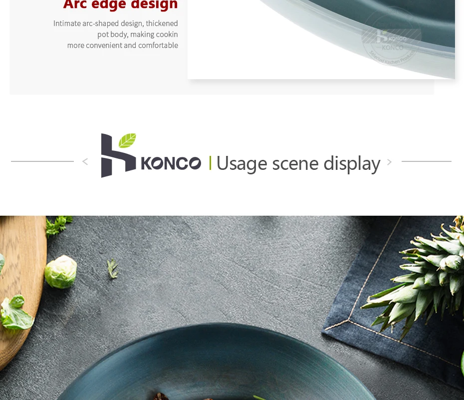 2.Design: Ergonomic pot body design, the inner corner of the cast iron pot is carefully designed, suitable for various cooking methods such as spooning, stir-frying, etc.