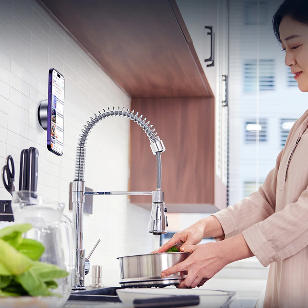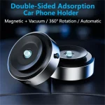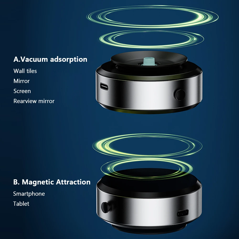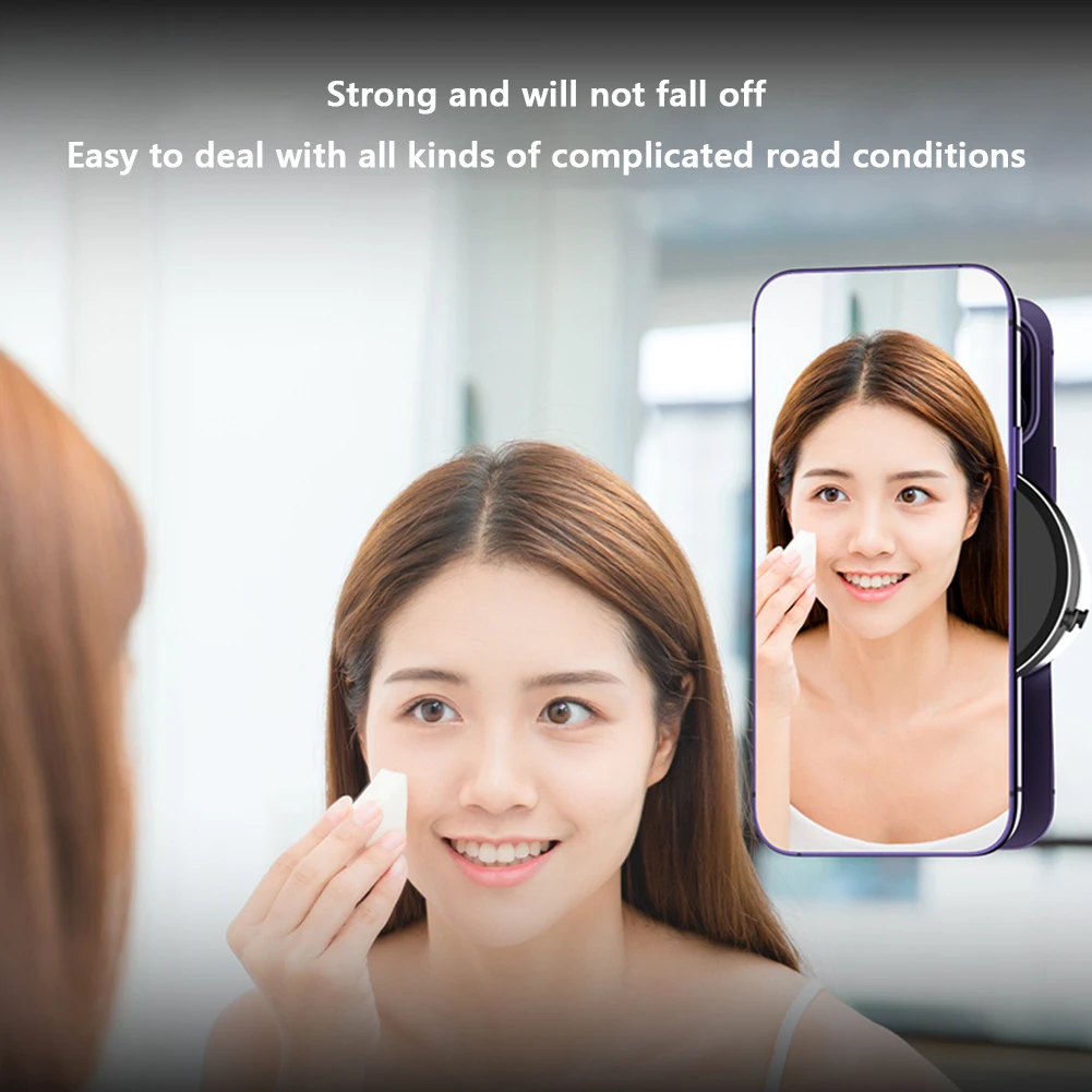 Feature: 1. Innovative Vacuum Adhesion: The car phone holder stand features advanced smart vacuum adhesion technology, unlike traditional magnetic holders. With an electrically driven vacuum pump and smart pressure monitoring, it securely attaches to metal surfaces, smooth walls, glass, and car screens, supporting over 10KG of weight. Charge once for up to 60 days of use, simplifying your daily life. 2. Strong Magnetic Hold: Equipped with the latest N52 neodymium magnets, the car mount mobile phone holder provides a powerful magnetic attraction of up to 1.5KG, ideal for handling sudden stops, speed bumps, and varied road conditions in your vehicle. It’s a perfect gift for parents and friends, ensuring your device stays securely in place. 3. Versatile Multi-Scene Use: This universal mobile phone bracket adheres to any smooth surface including mirrors, steel, and screens, making it perfect for driving, working out, cooking, and even doing makeup. Its strong, lasting grip allows for easy attachment and detachment with just a light placement and a press of a side button. 4. Universal Compatibility: Designed for Compatible with iPhone models with MagSafe, this hands-free shower phone holder also includes a metal ring for non-magnetic phones and cases. Simply attach the ring to the back of your device or case, and let it set for 24 hours to maximize adhesion, making it compatible with a wide range of smartphones. 5. Compact and Lightweight: Constructed from zinc alloy for high strength and durability, the phone mount is corrosion-resistant and shines like new thanks to its multi-layer plating. Weighing only 75 grams and with a diameter of 65mm, its compact and lightweight design allows you to easily carry it in your pocket or backpack, ready for wherever your day takes you. About magnetic adsorption and vacuum adsorption: Precautions: Note: