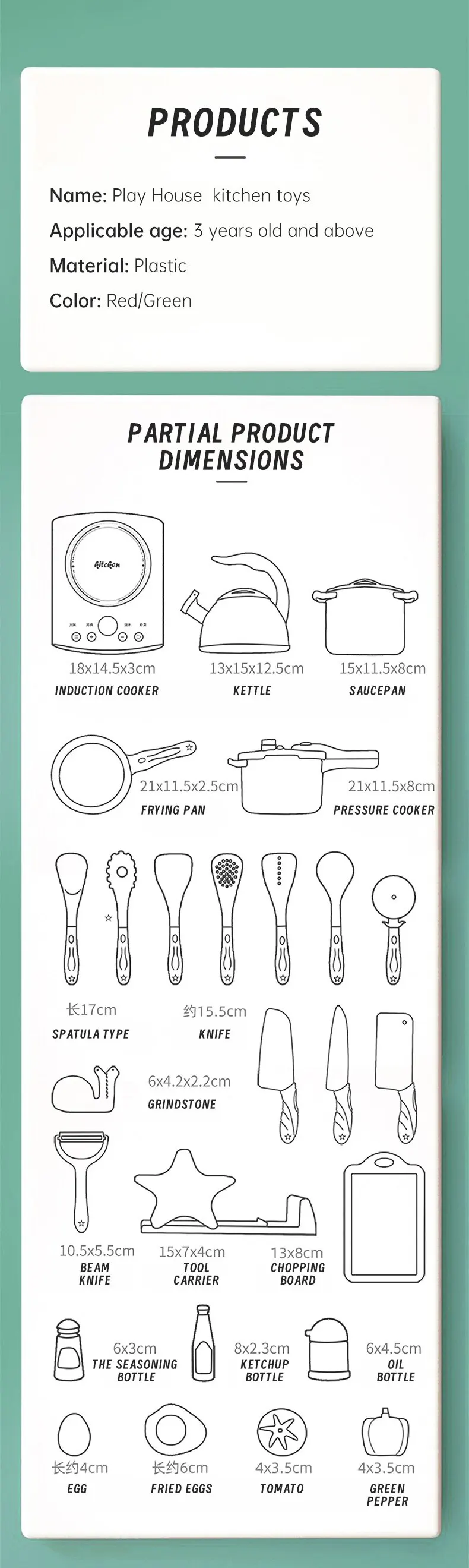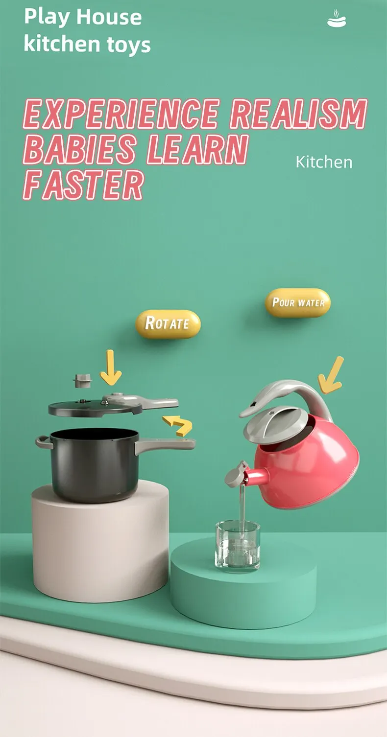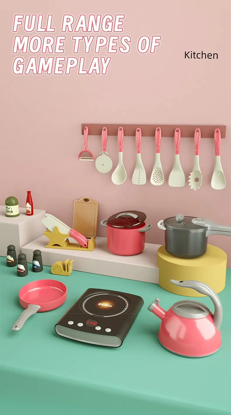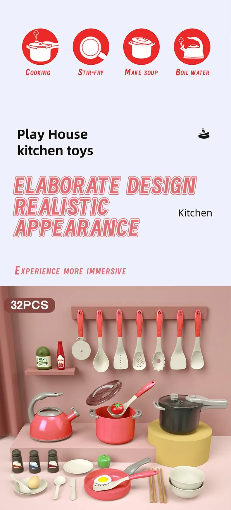 • 32pcs Kids Kitchen Cooking Toy Set :This set includes 32 pieces of toy cooking utensils, pots, pans, and food play-sets, providing a complete kitchen experience for kids.