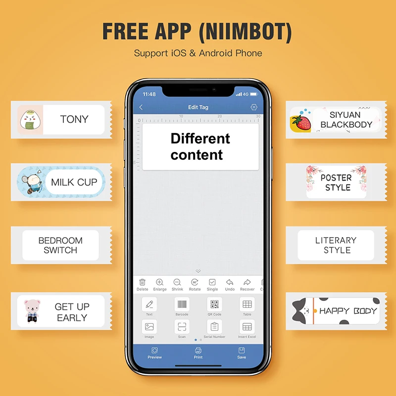 The APP NIIMBOT contains various free texts, graphic symbols and business icons.