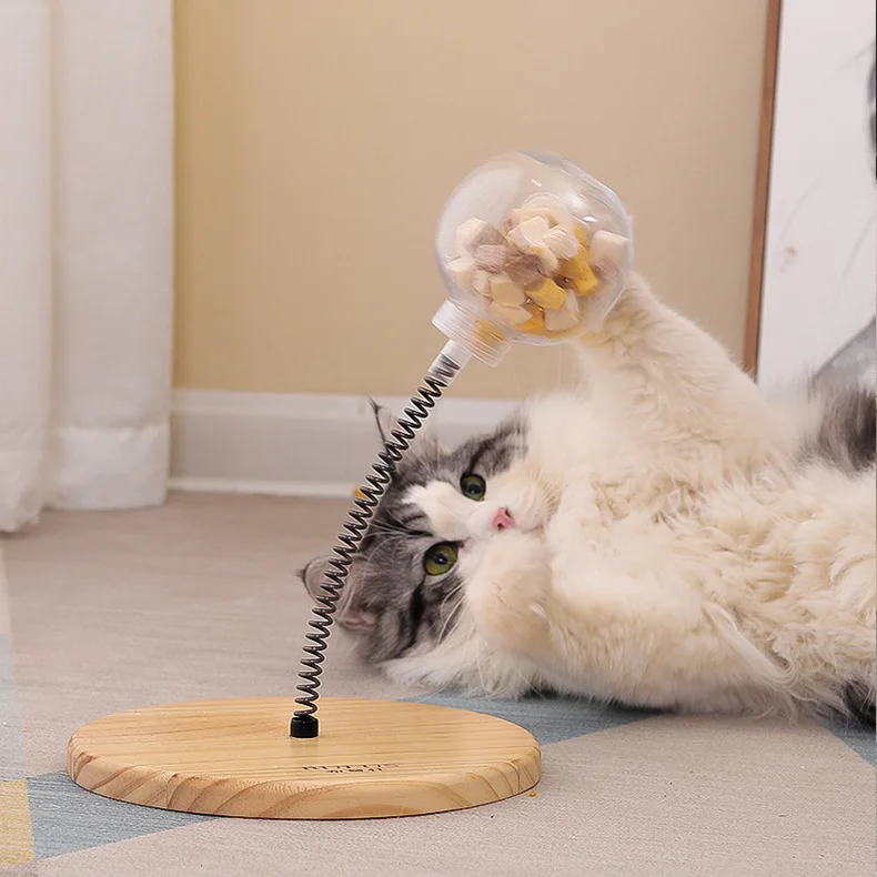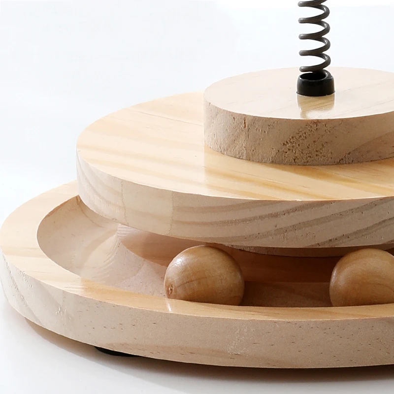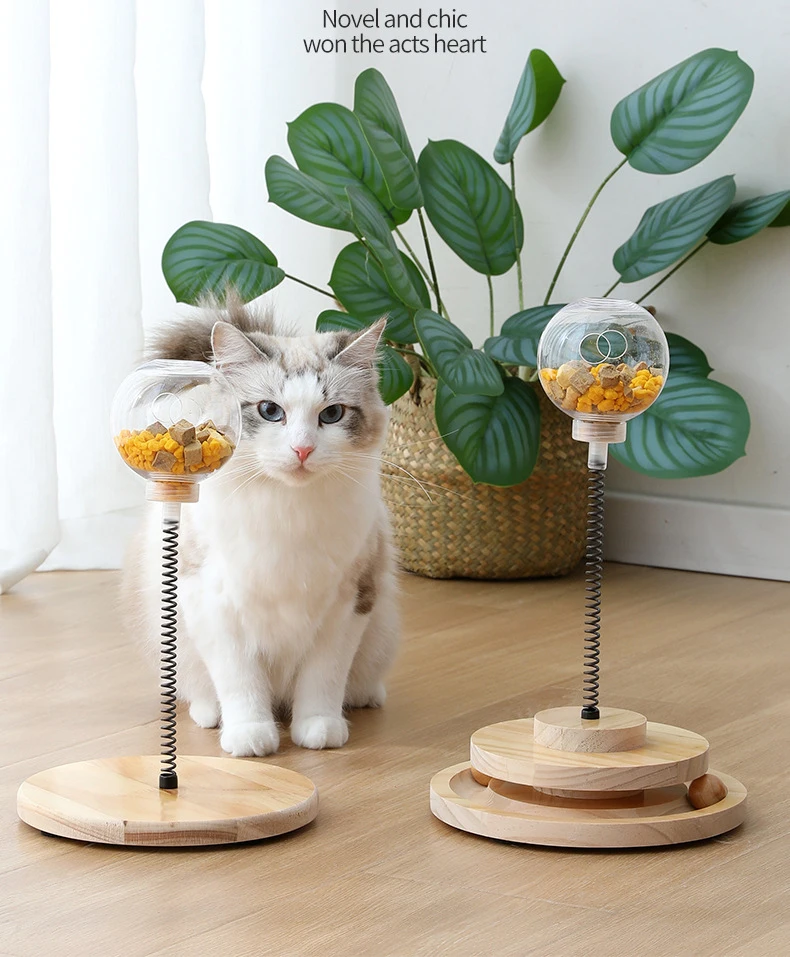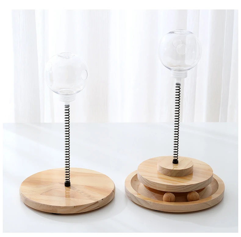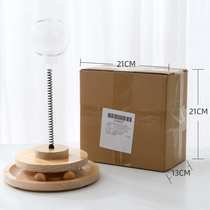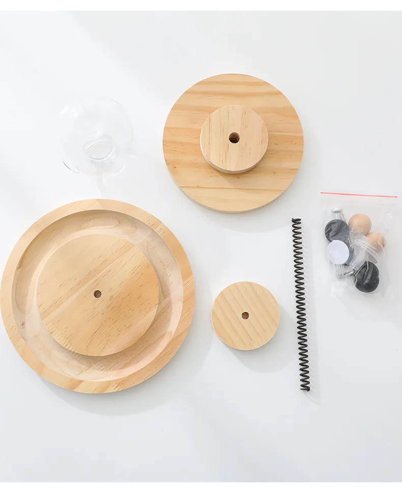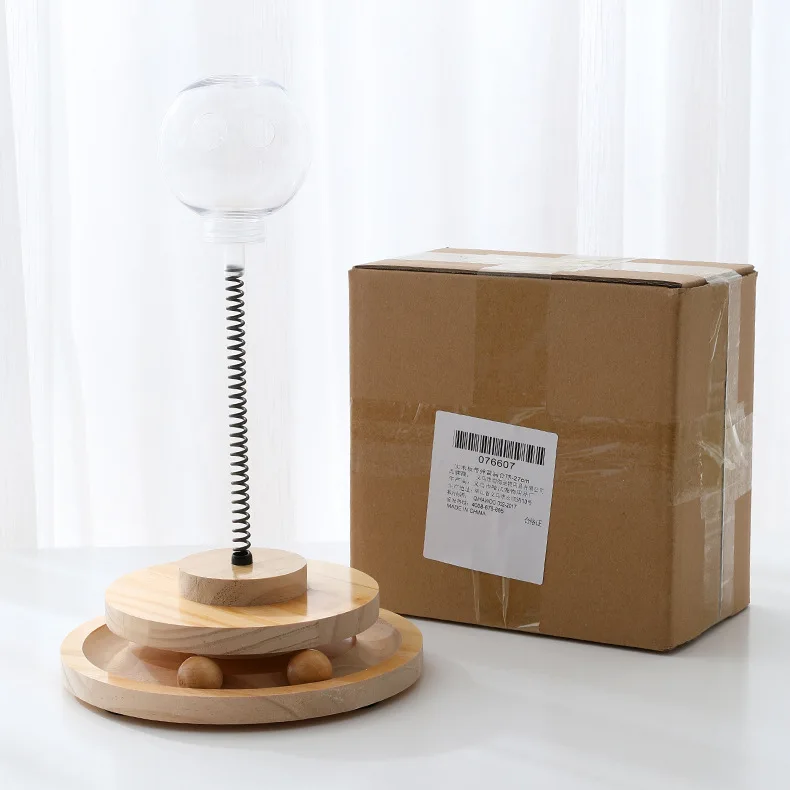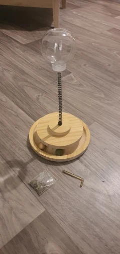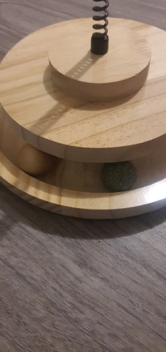 The article consists of two wooden trays of very good quality, a spring, a plastic ball to incorporate the food, two balls one made of wood and one of cat grass and a bag of cat grass with a key to fix it all.