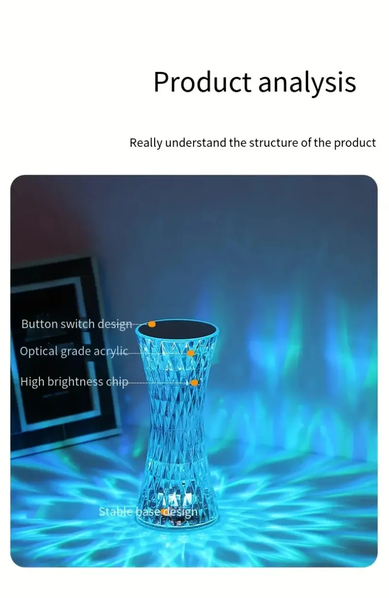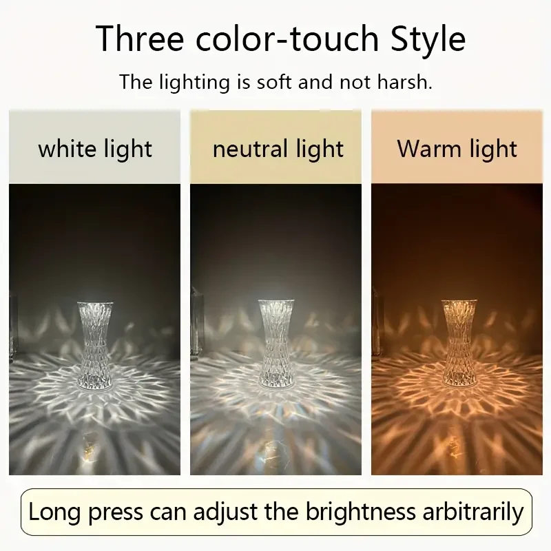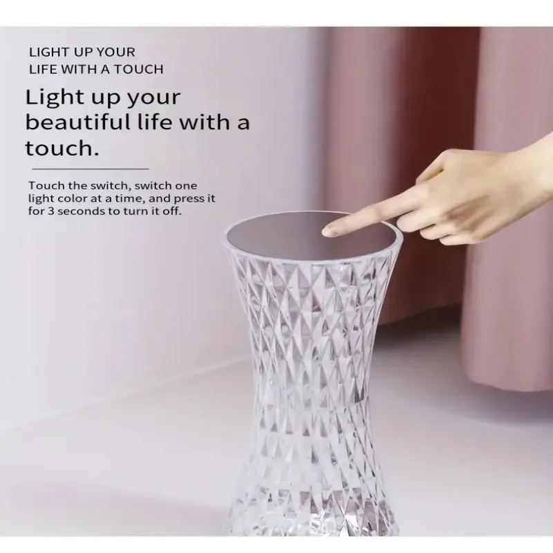Turn on the switch, the table lamp can present a charming light effect. Acrylic material, clear and smooth lines, simple design. Touch the top of the lamp to turn it on or off, or you can turn it on or off by remote control (3-color table lamp without remote control)