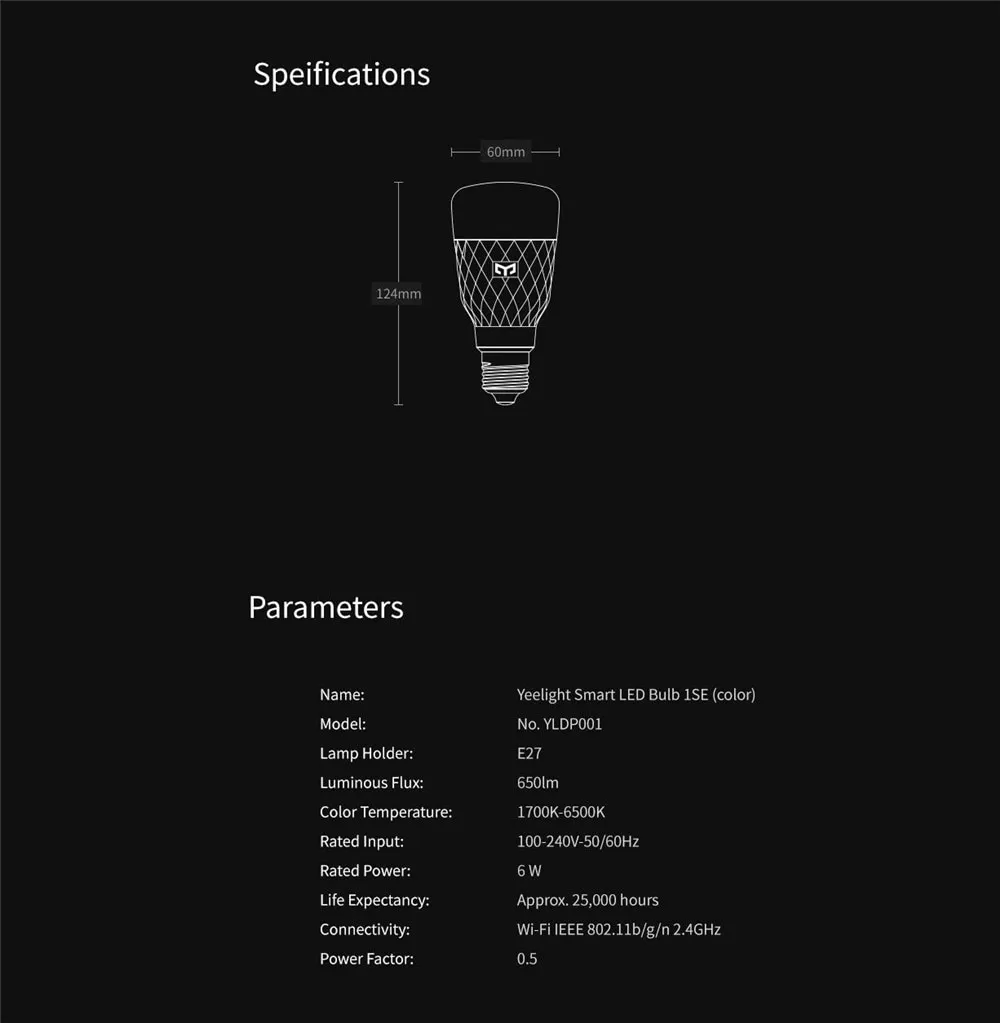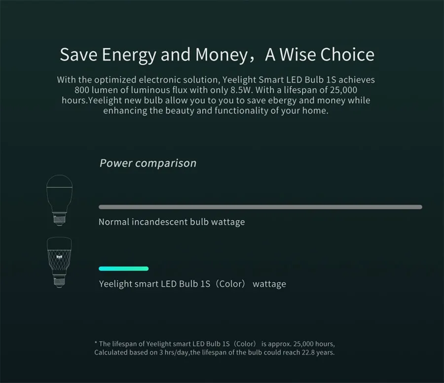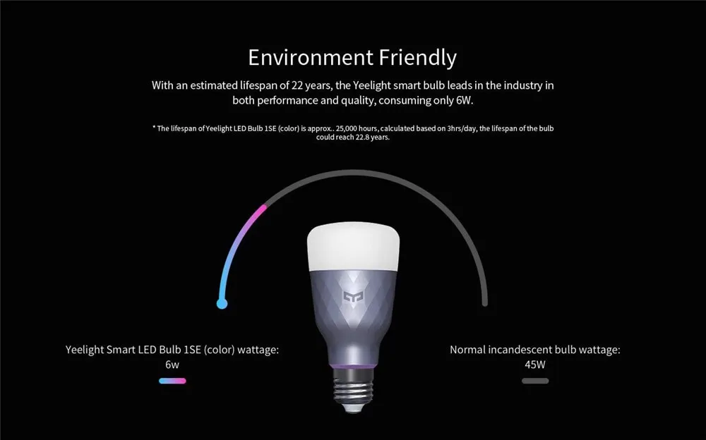 Yeelight 1SE smart LED bulbs consuming only 6W, saving energy and using less power than normal incandescent bulbs.