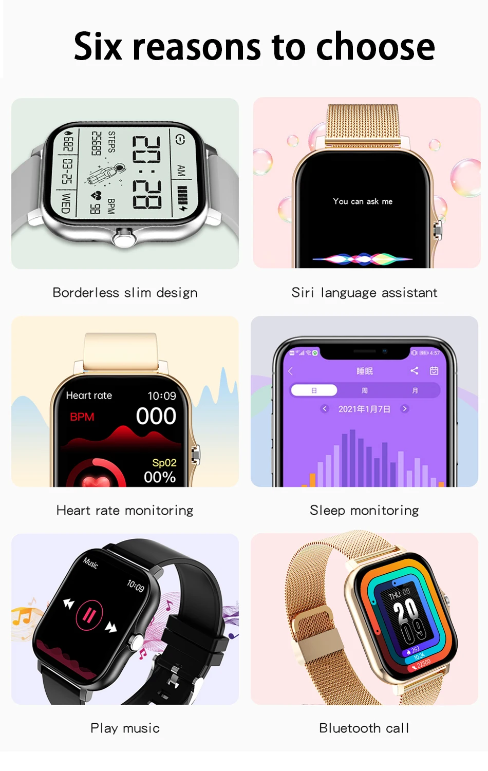 Custom dial, Music control function, Bluetooth call, Calls Reminder, Social APP reminder, Messages Reminder, Sedentary reminder, Blood Pressure, Blood Oxygen , Sport Mode, Alarm, Play the music, Stopwatch.