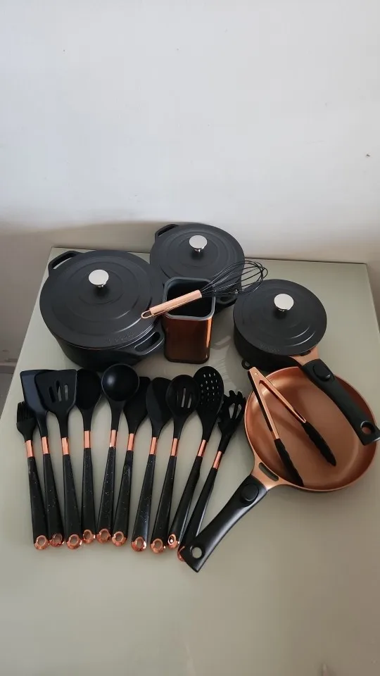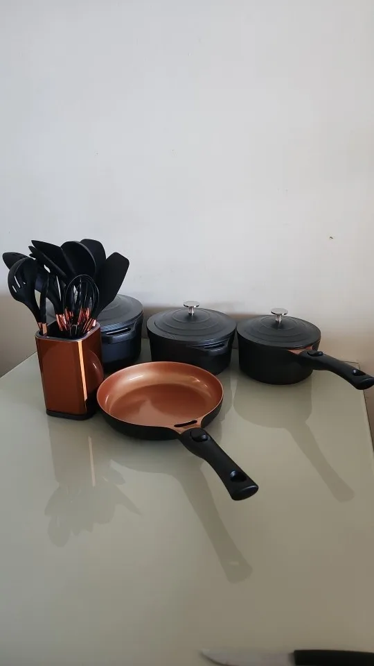 Wonderful!!! Is exactly everything I wanted!!! I bought it to match my Le Cook cookware and combined so much that it seems like it's all a set. I was afraid of some repeated or missing a piece, but all the pieces arrived, all right. The only problem is that it does not come so well packed, the box arrived a little dented and I could notice some small scratches on some pieces, but nothing that would affect the beauty and usefulness of the product. I just loved it!!!❤️❤️❤️❤️❤️