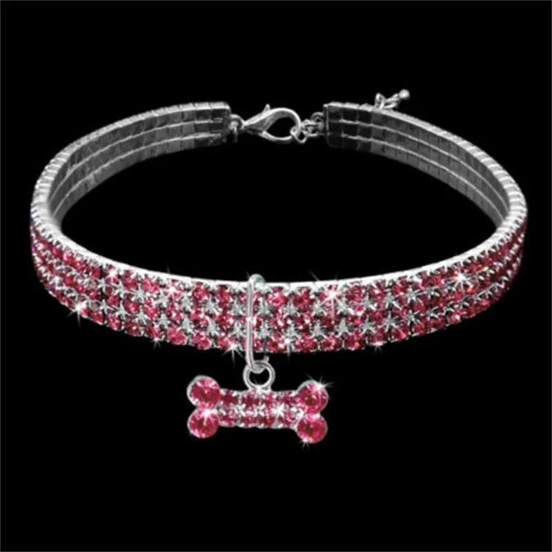Rhinestone Puppy Dog Collars Jeweled Crystal Kitten Cat Necklace Bone Charm Pendant Accessory For Girl Dogs Cats Yorkshire Pink
