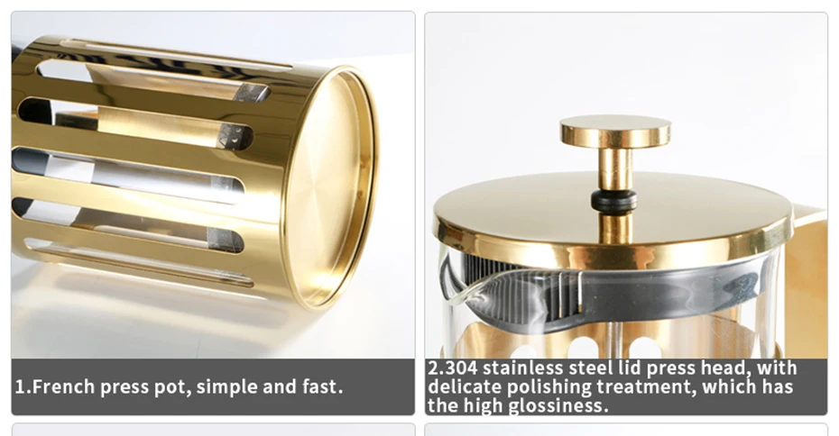 1.304 stainless steel lid press head, with delicate polishing treatment, which has the high glossiness. Handmade glass cup, round pot mouth, the water yield is smooth and even