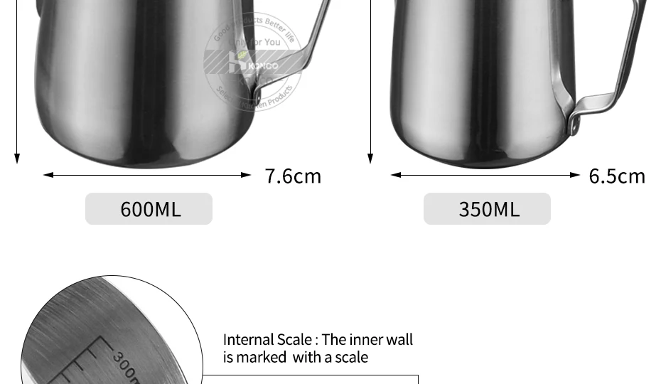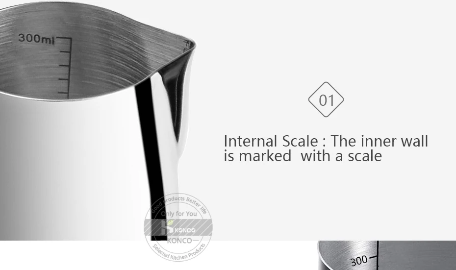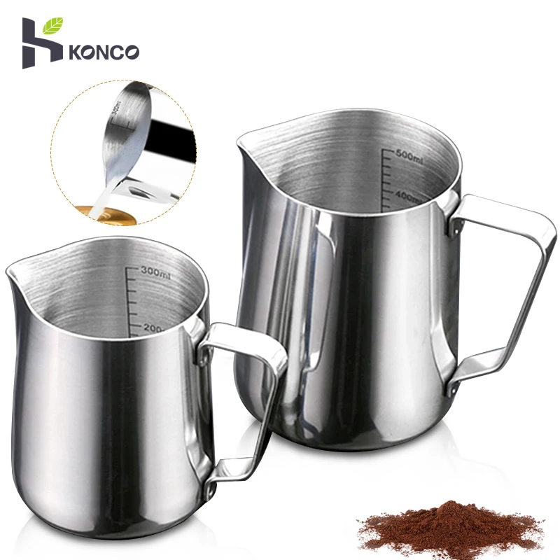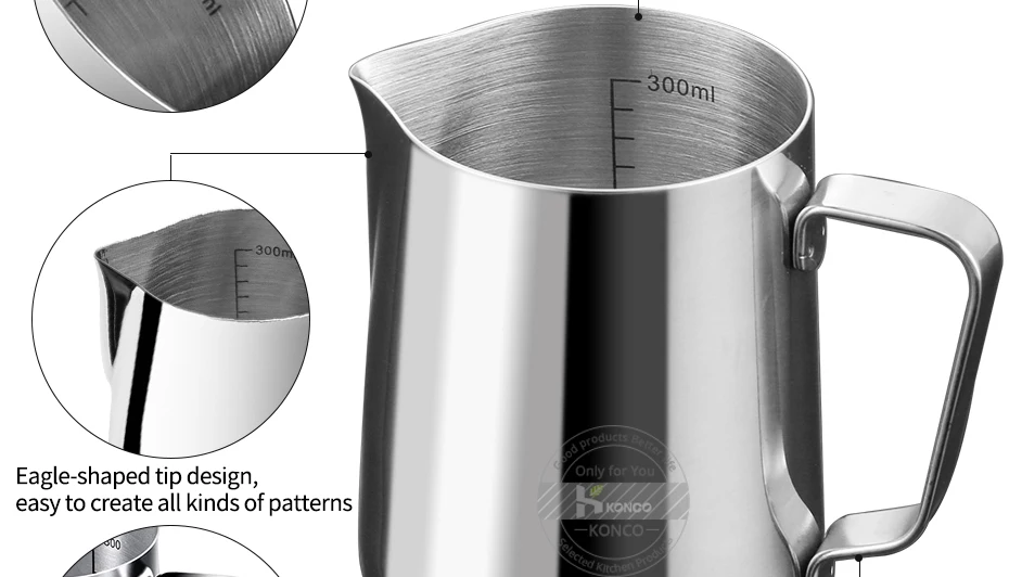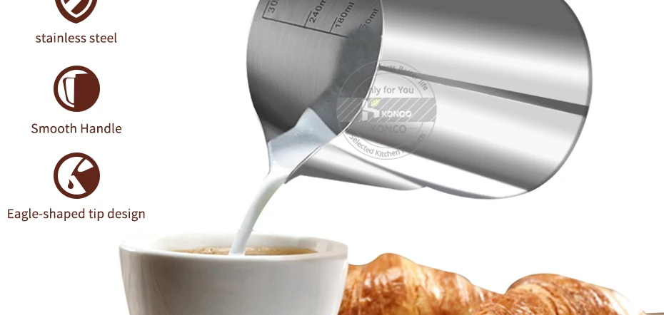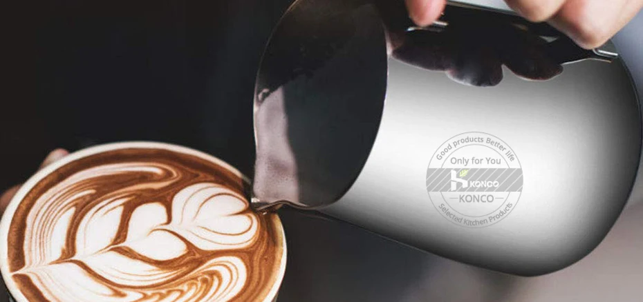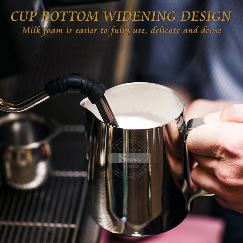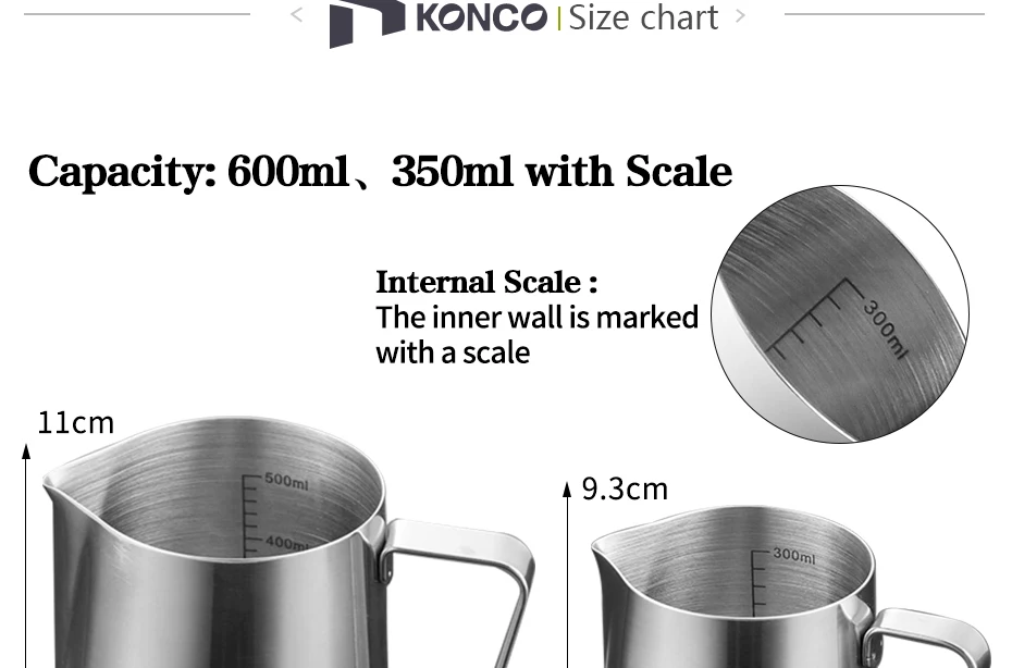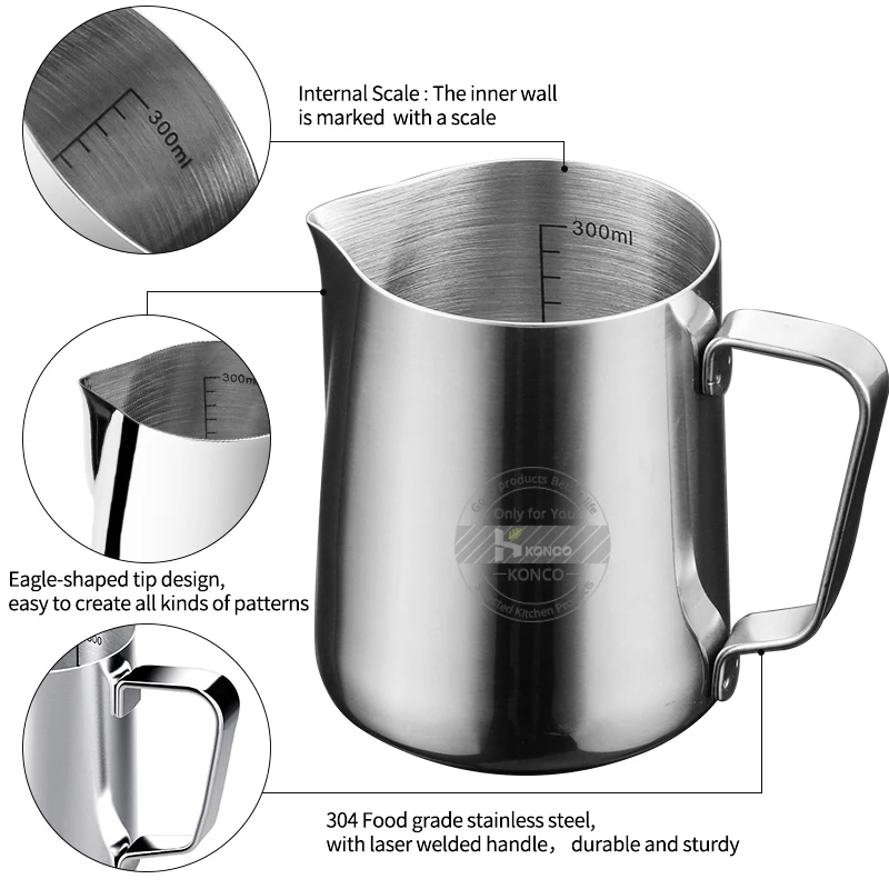 【PROFESSIONAL QUALITY】 KONCO frothing pitcher is made of Food-grade 18/8 stainless steel with non-stick teflon coating, rust-proof, stain-proof, crash-proof and heat-resistant, solid and durable for long-term use. Easy to clean & Dishwasher safe.