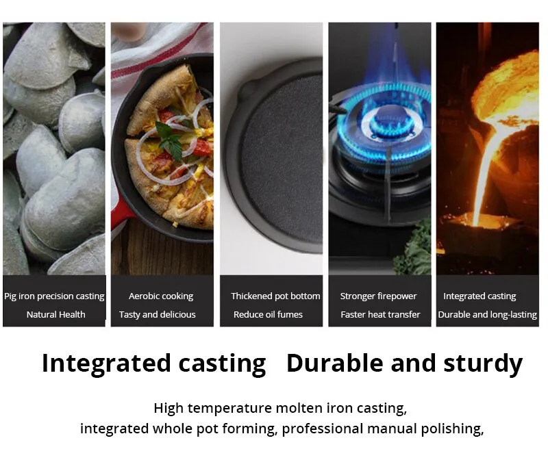4. Good heat storage performance, cooking speed increased by 40%, high-purity cast iron to ensure good heat storage performance, 360 degrees heating, uniform heating, to ensure the natural nutrients of ingredients