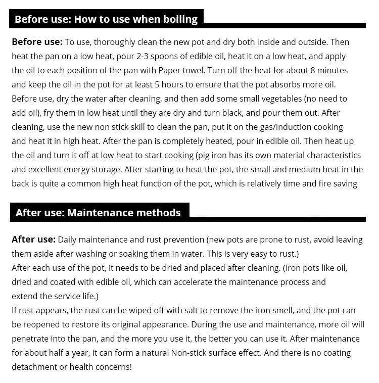 2. Iron pots are mostly made of pig iron, generally do not contain other chemicals, iron pots are so far safe. Safe kitchenware in the process of stir-frying, cooking, there will be no dissolution five, there will be no falling off problem, even if there is dissolution of the dissolved, the human body absorption is also beneficial.