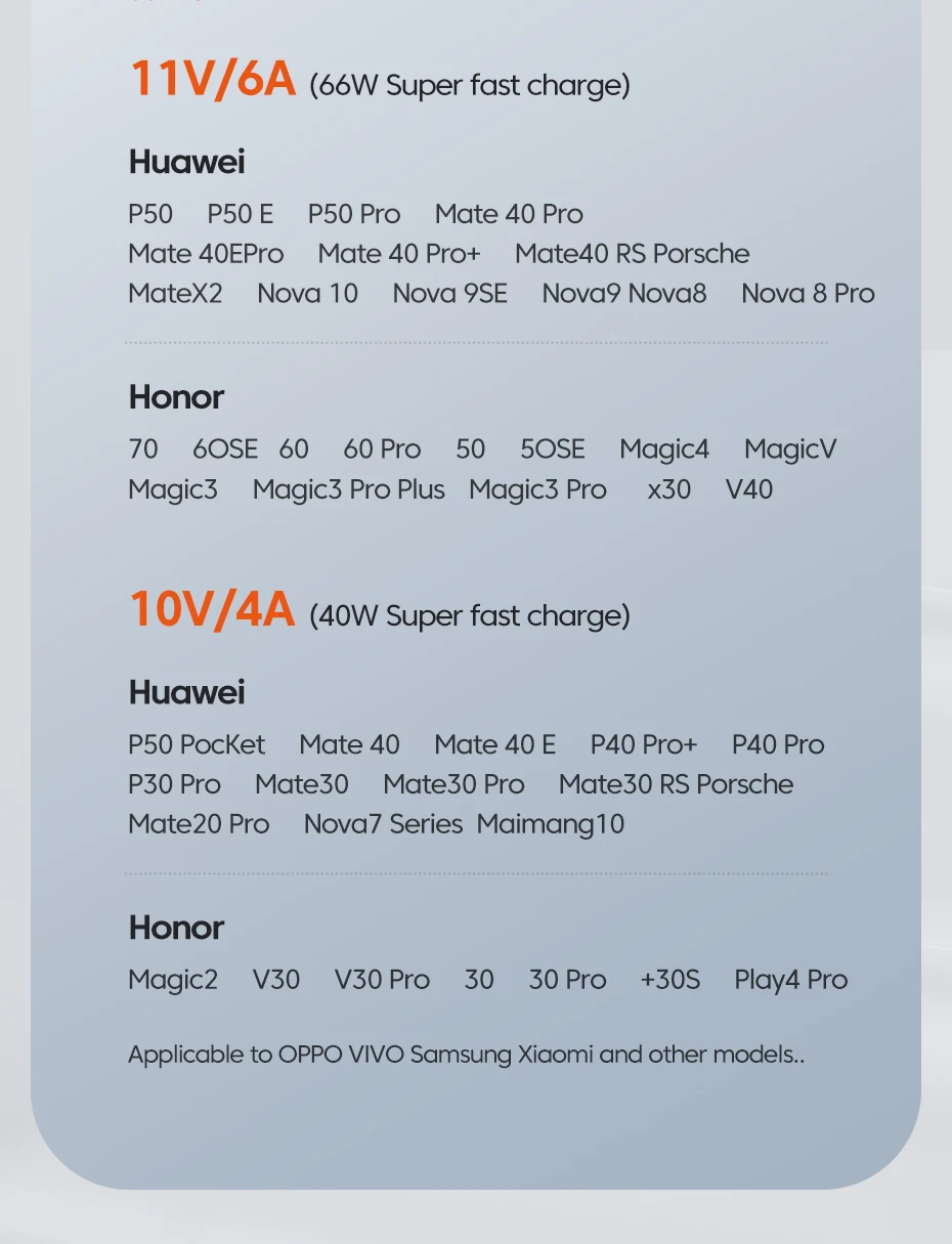 One Cable Fully Compatible for Huawei The data cable is compatible for Huawei (all series)fast charging systems, and is backward compatible with 11V/6A 10V/4A 4.5V/5A fast charging specifications.