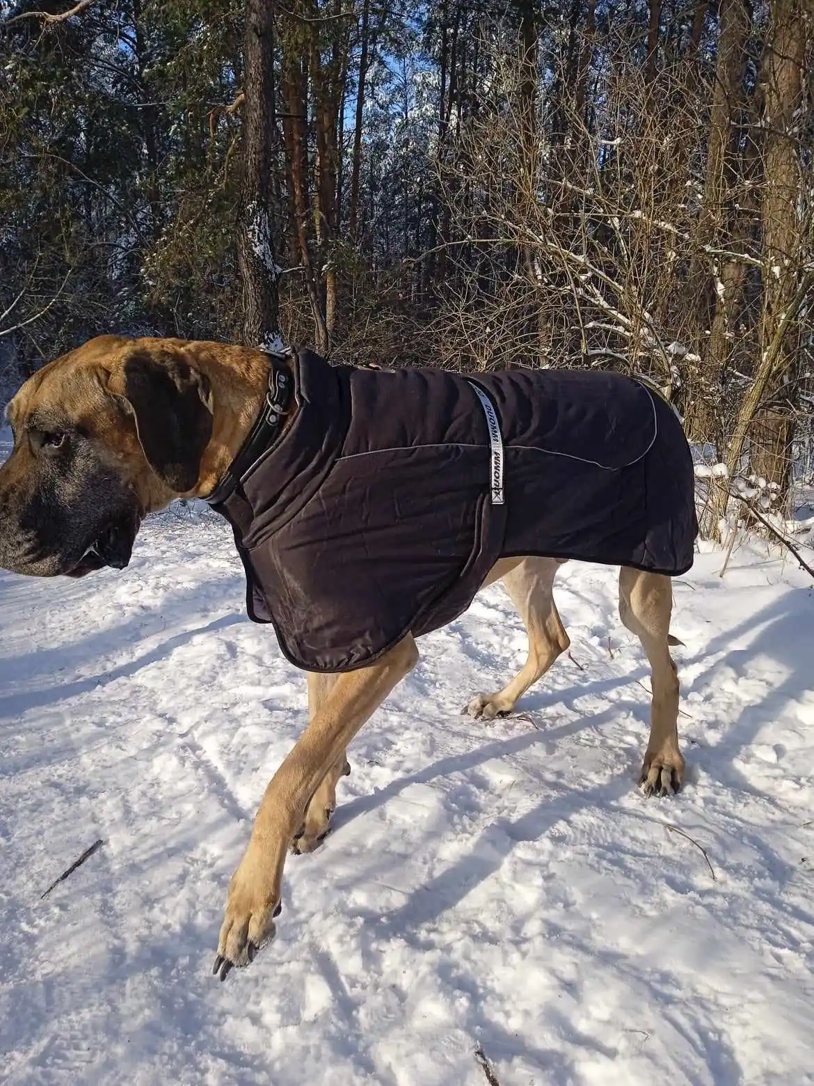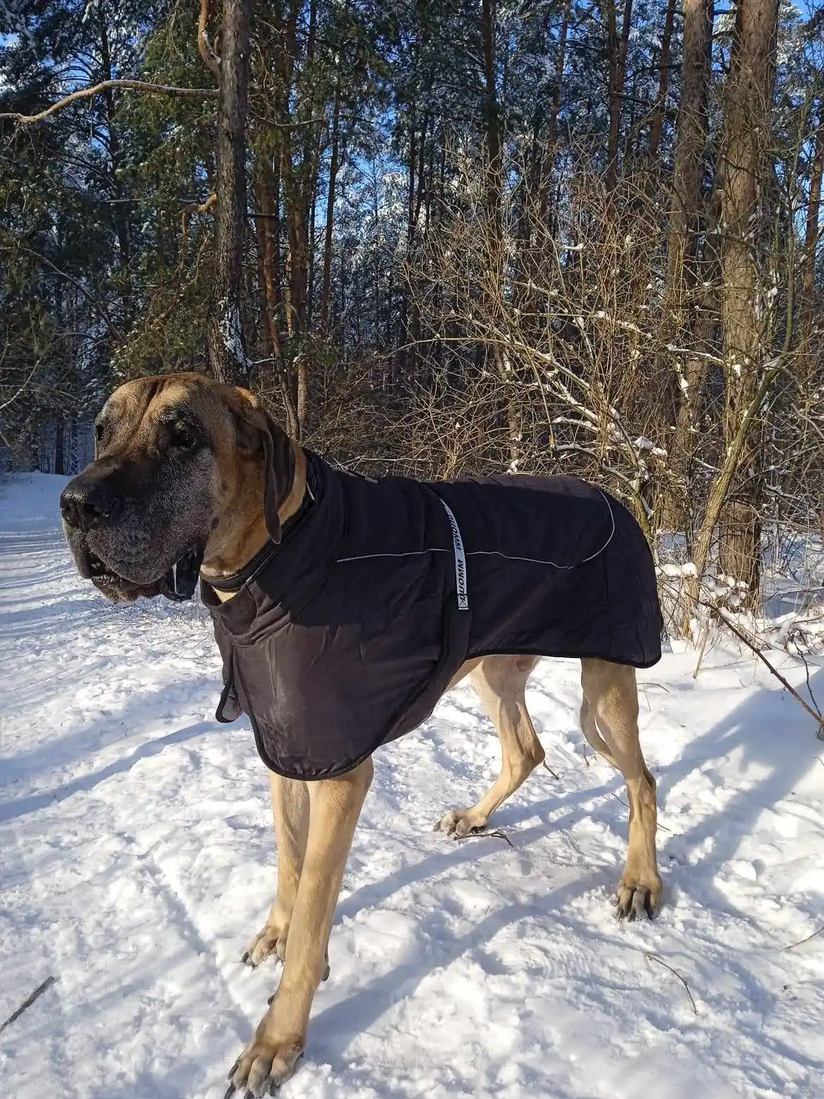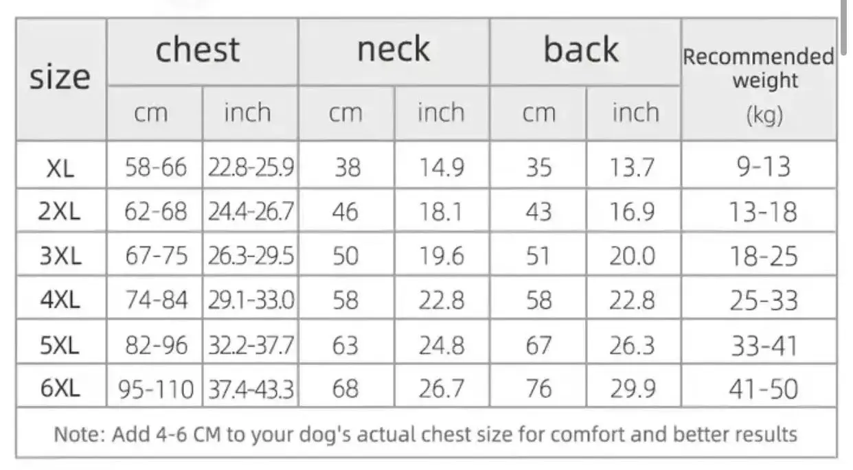 The clothes are perfect for my dog-Great Dane. I was looking for suitable clothes for such a large 6XL dog for a long time: neck 65cm, chestnut 105 cm, back length 90 cm, weight 80 kg. On the walk, the dog was comfortable, running and jumping. I am happy with the purchase. I recommend and thank you.